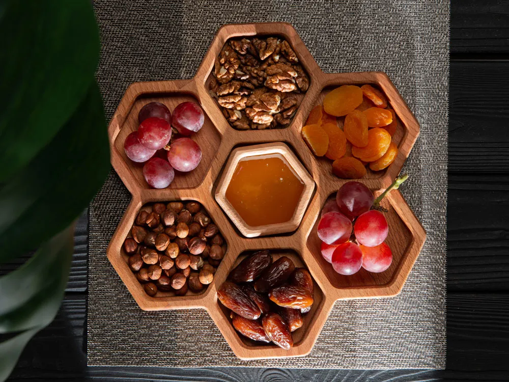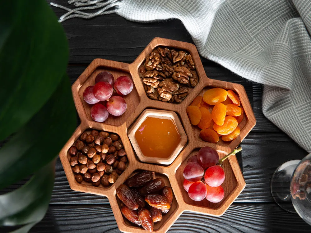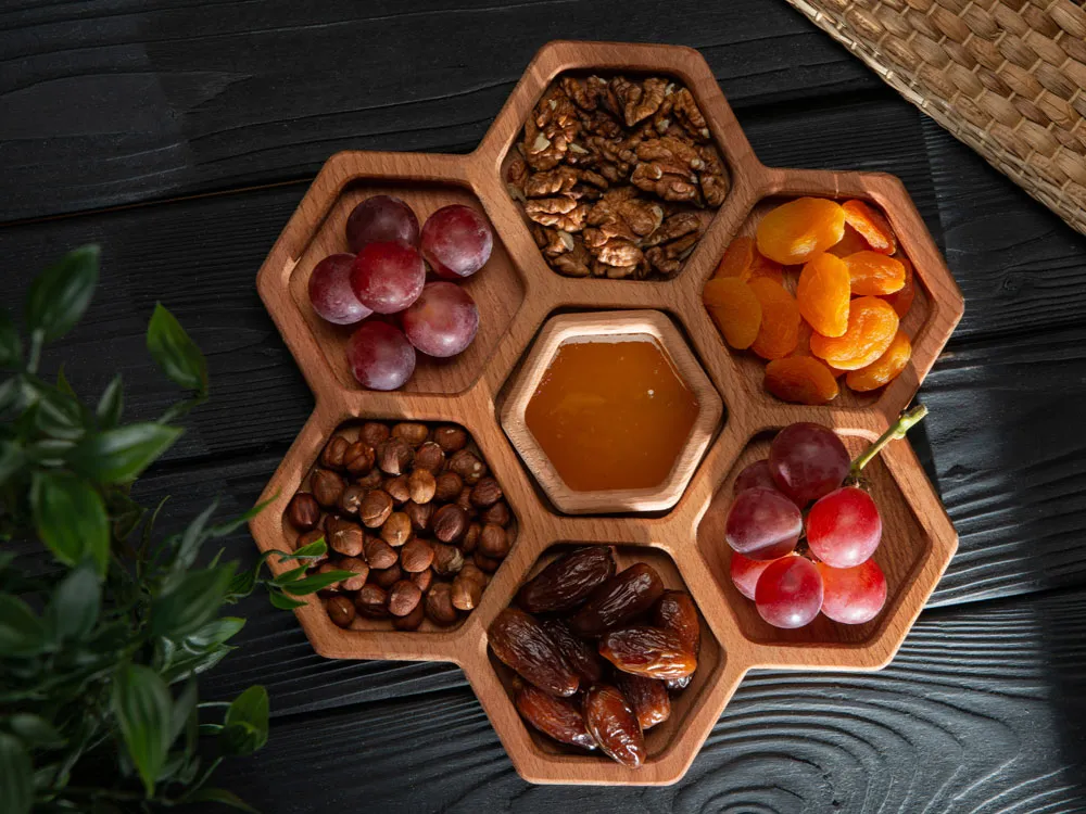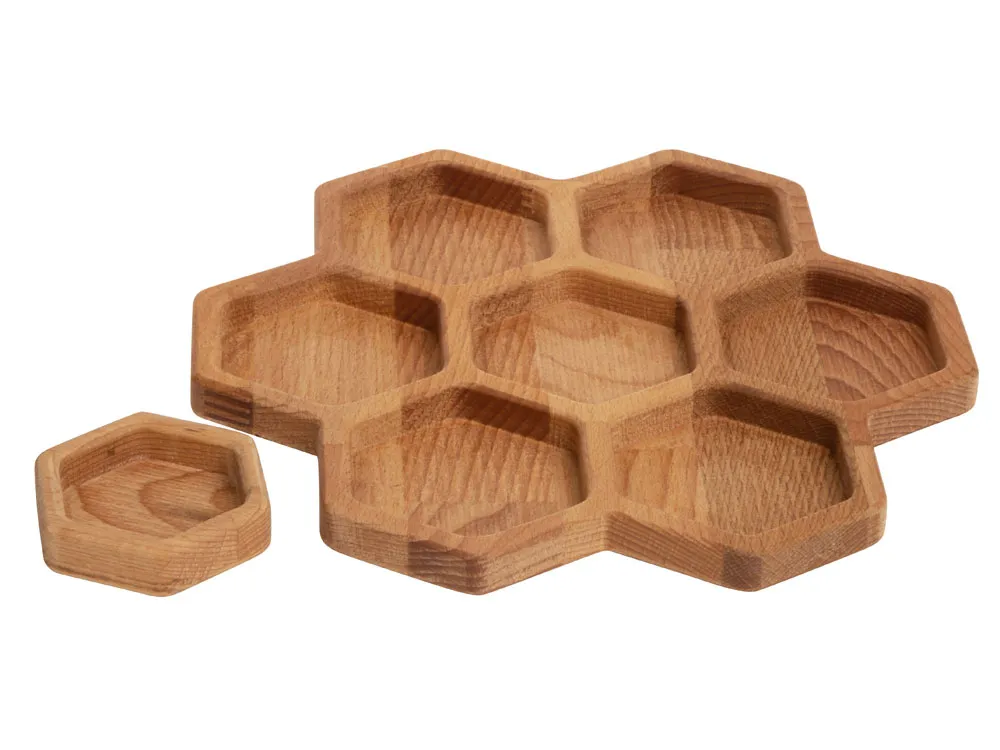 Менажница выполнена в виде семи сот для разных видов закусок — за бонусную дополнительную отвечает съемная сота-соусница, в которую можно залить мед или любимый соус. Менажница выполнена из бука и пропитана маслом, что обеспечивает изделию свежий вид. Советуем регулярно смазывать дерево пищевым маслом, чтобы изделие дольше радовало вас. - натуральный бук - съемная соусница - интересный дизайн - вариант для подачи 8 видов закусок - можно использовать для сервировки закусок