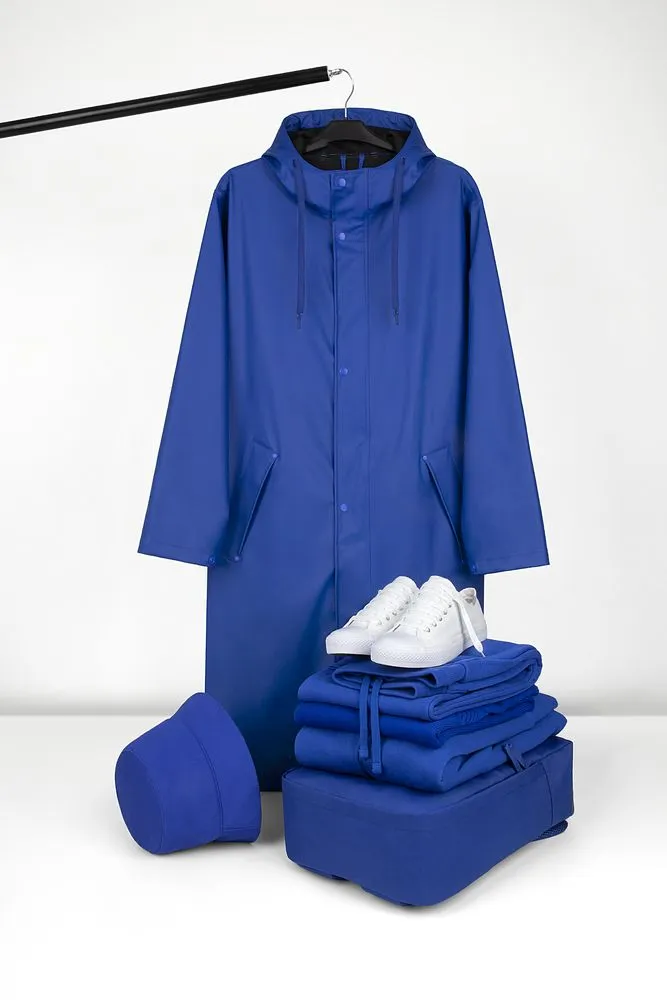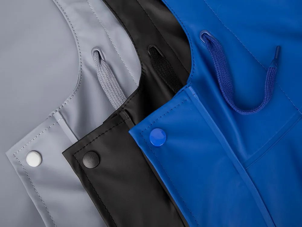 Плащ-дождевик с капюшоном из полиэстера с полиуретановым непромокаемым покрытием.
