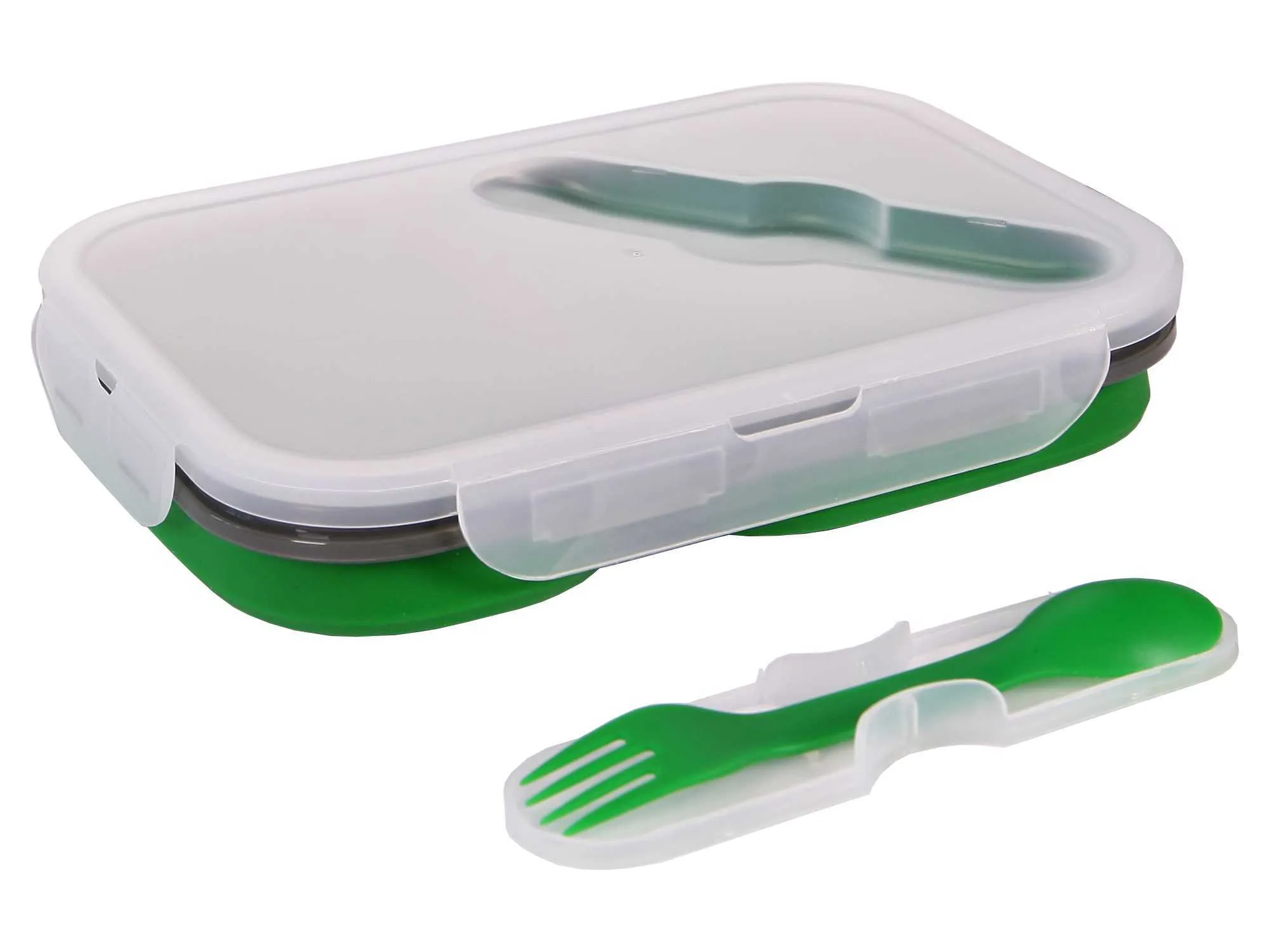 Герметичный выдвижной ящик из силикона и полипропилена с двумя отделениями емкостью до 480 мл и 760 мл. Вверху крышки находится штуцер со столовыми приборами (в комплекте) с функцией 2 в 1, вилкой и ложкой. Коробка подходит для микроволновой печи, крышка должна быть снята. 212 x 153 x 73 мм | Изгиб: 212 x 153 x 38 мм