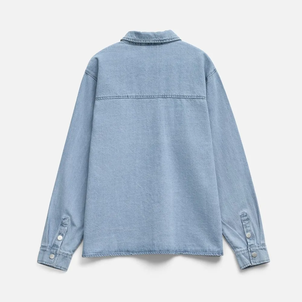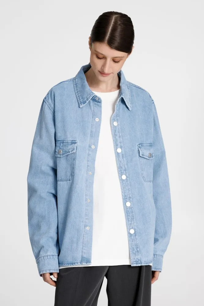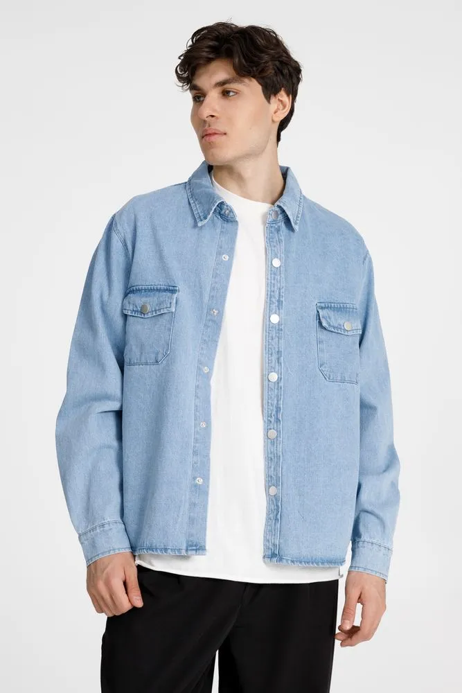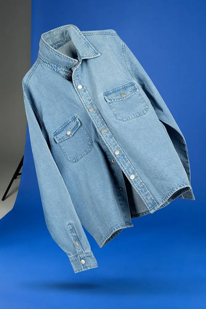 Джинсовая куртка-рубашка унисекс на кнопках прямого силуэта.