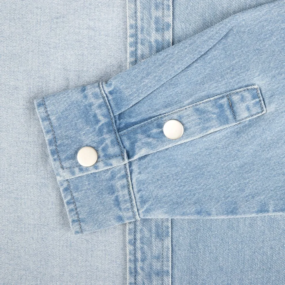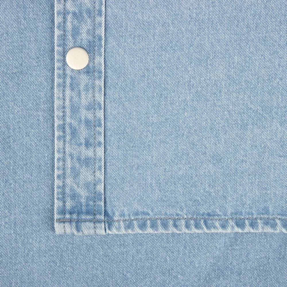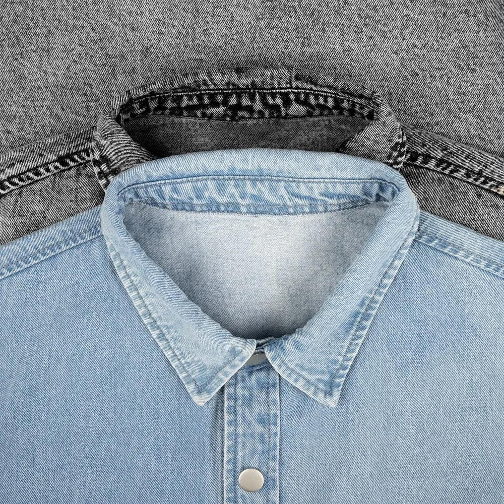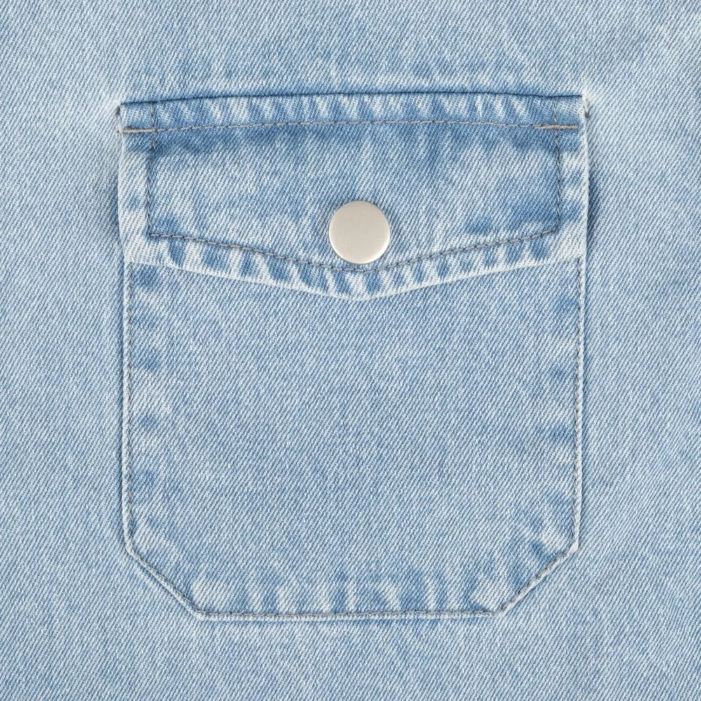Джинсовая куртка-рубашка унисекс на кнопках прямого силуэта.