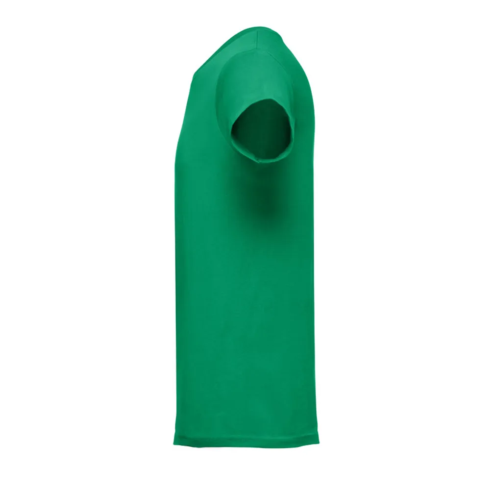 Мужская трикотажная футболка из 100% хлопка (150 г/м²), трубчатого формата. Цвет 83: 90% хлопок/10% вискоза. Воротник в резинку 1x1 с усиливающей лентой джерси. Двойной шов на рукавах и нижней части изделия.