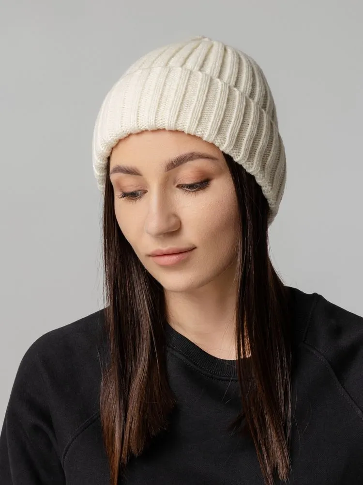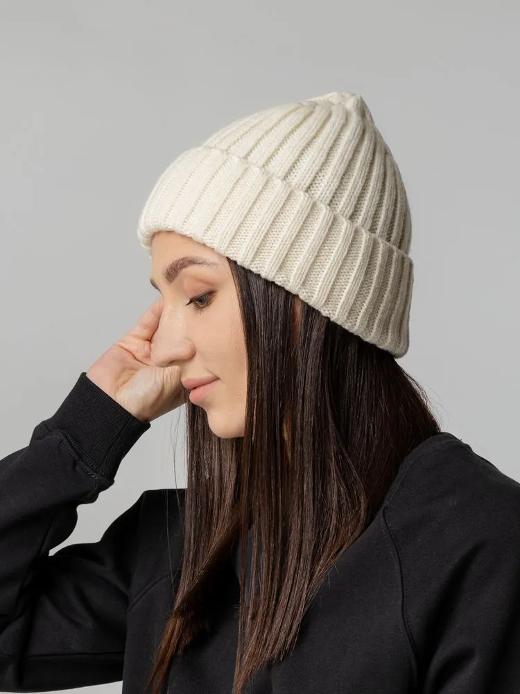 Однослойная шапка рельефной вязки с отворотом.