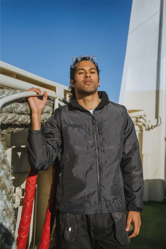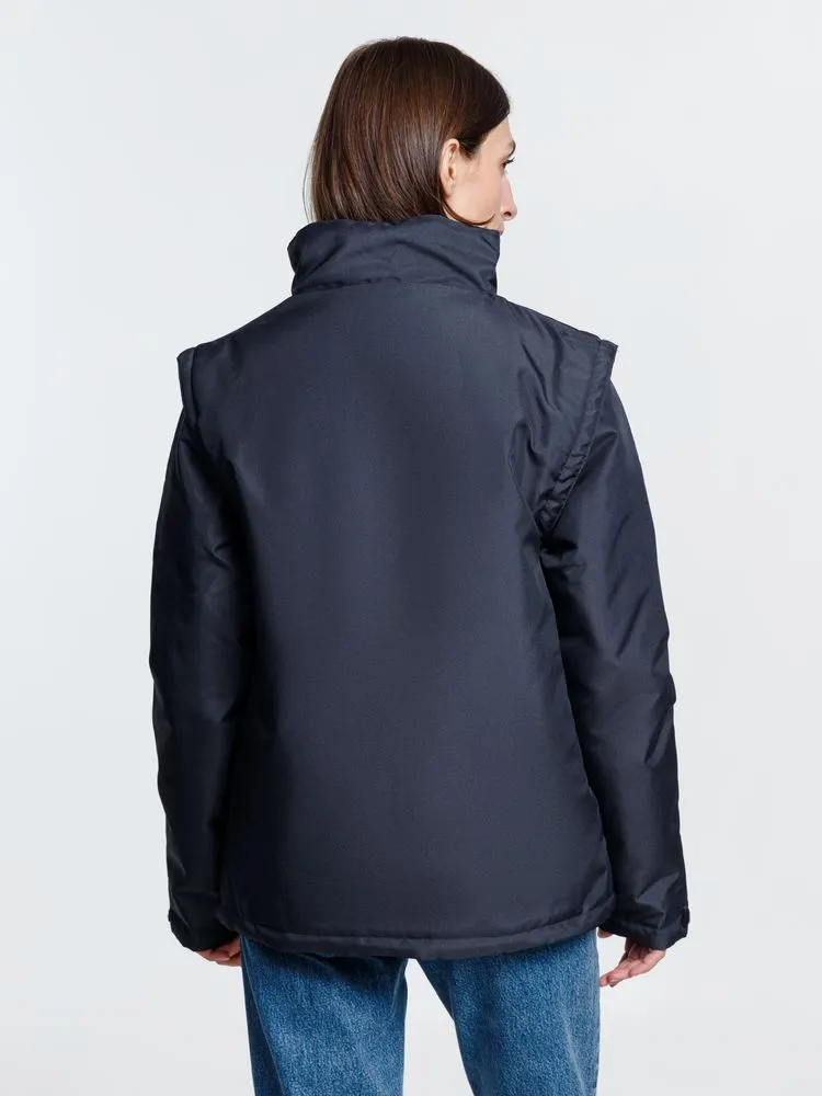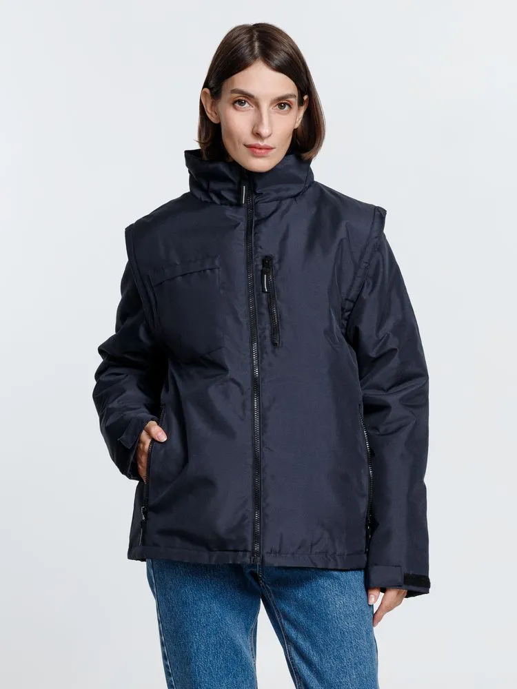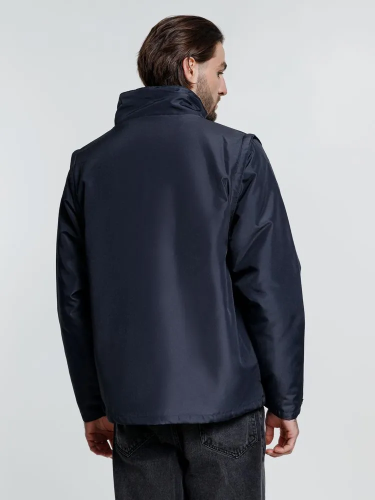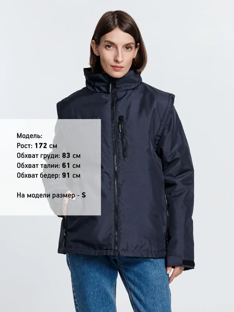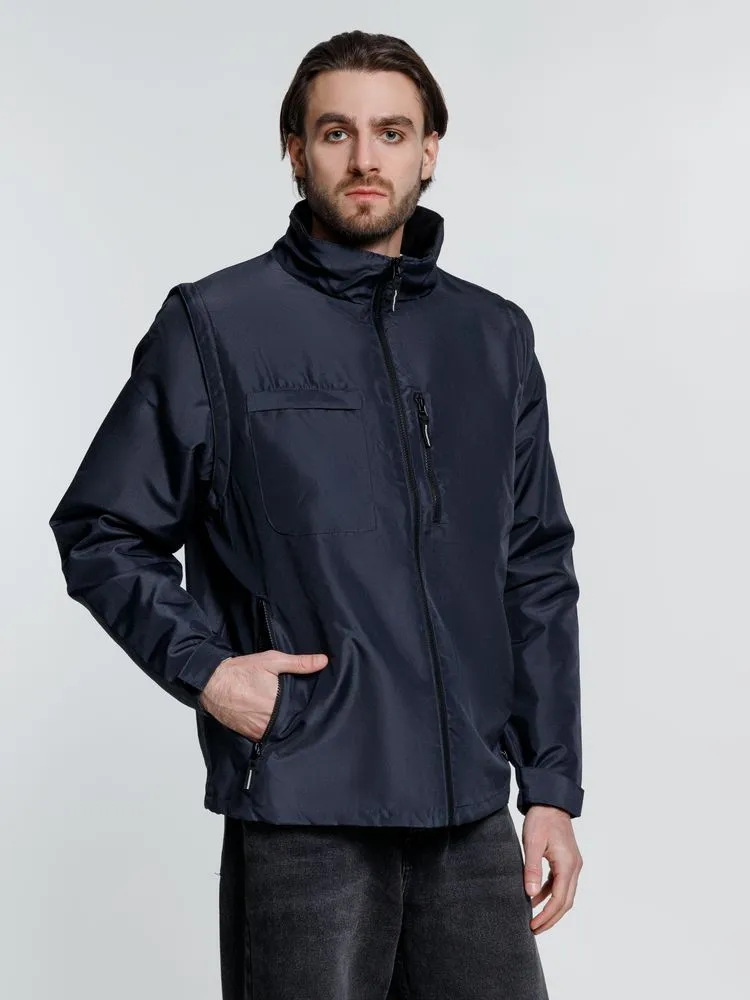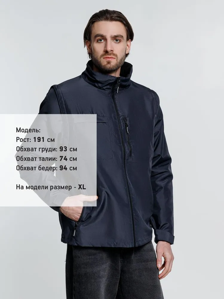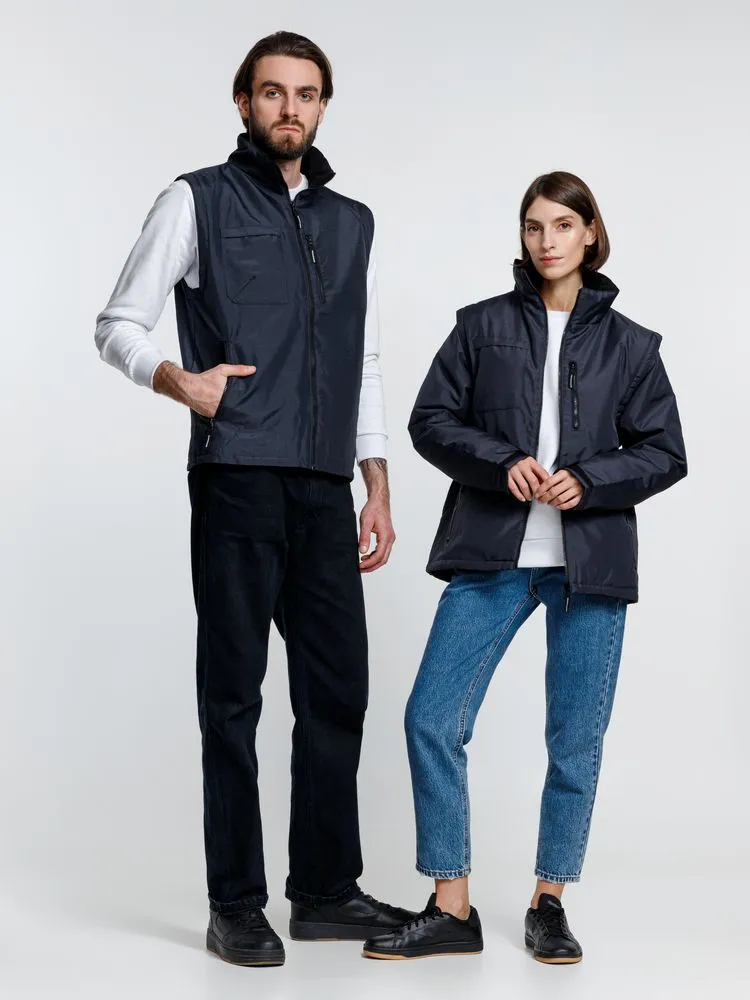 Куртка-трансформер, которая превращается в утепленный жилет. Выполнена из ткани оксфорд с водоотталкивающим покрытием. Модель унисекс.