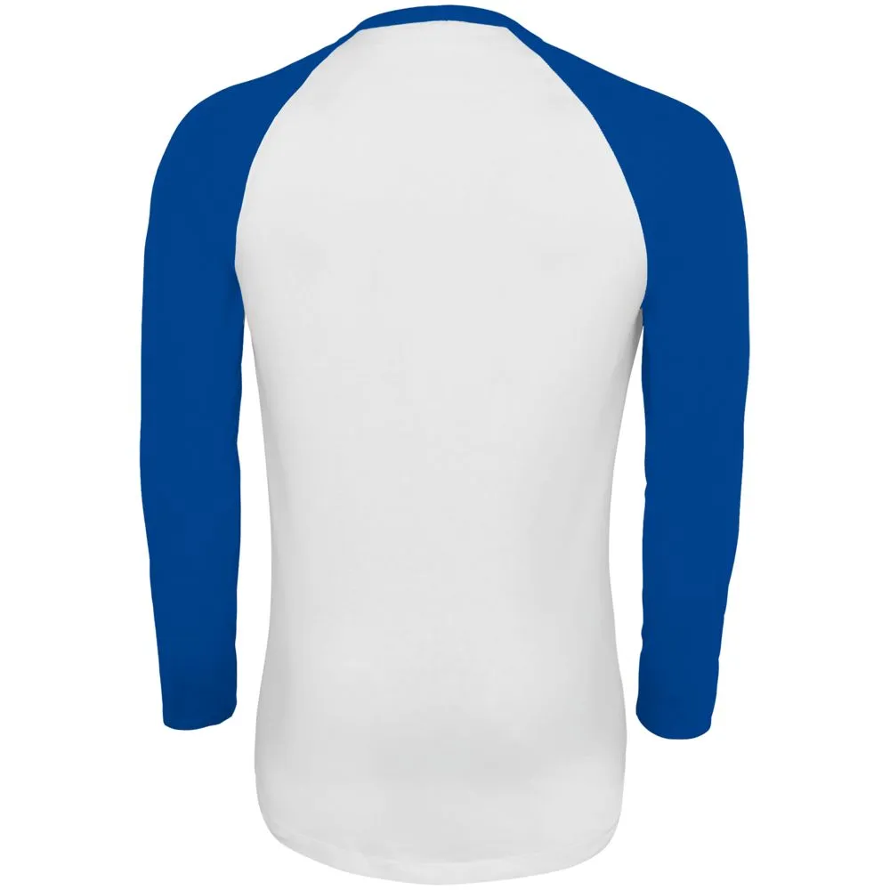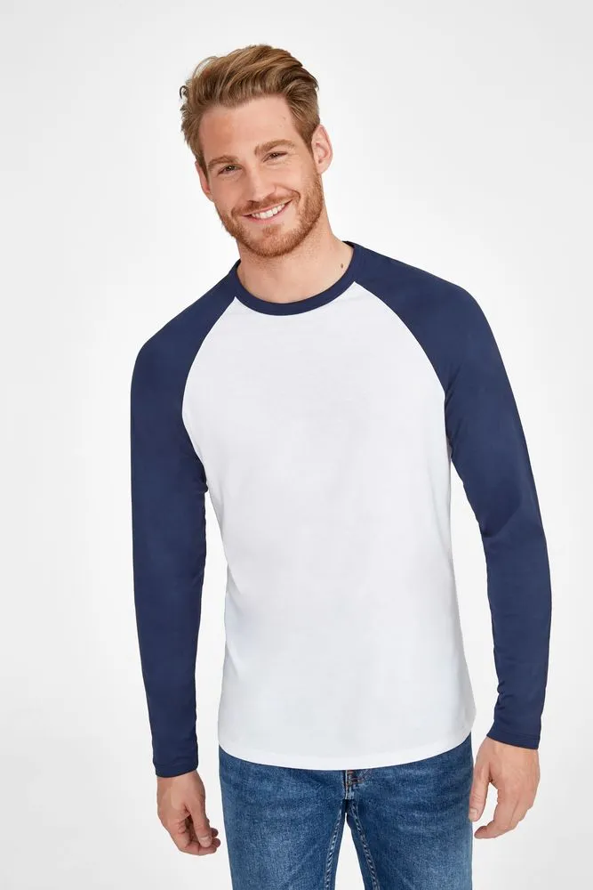 Мужская двухцветная футболка с боковыми швами, длинным рукавом реглан и закругленным низом.