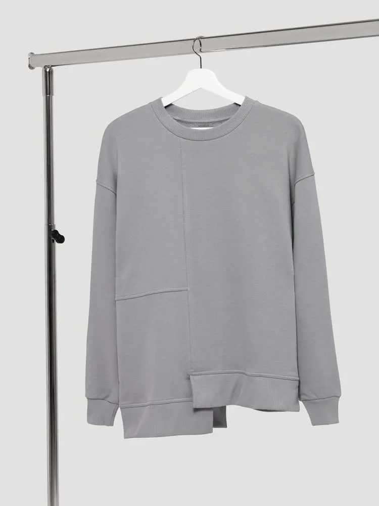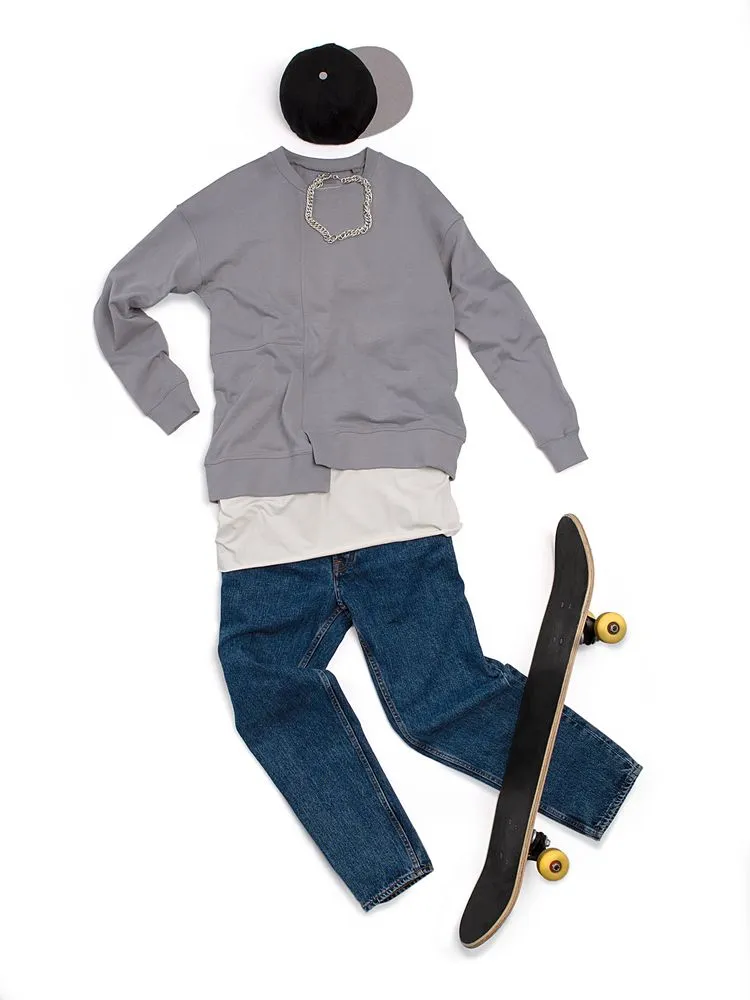 Свитшот унисекс свободного кроя со спущенным плечом и нестандартным нижним краем.