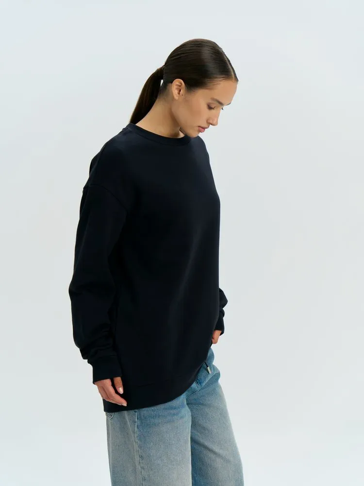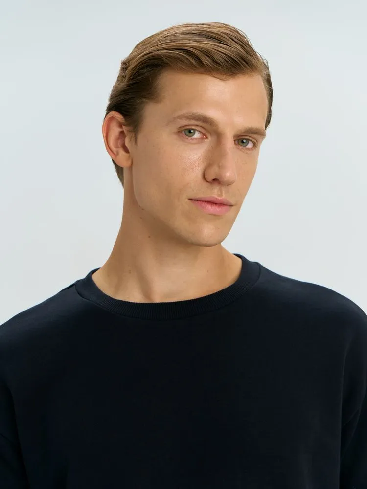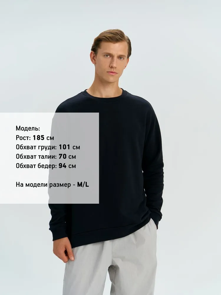 Свитшот унисекс со спущенным плечом и удлиненной спинкой.