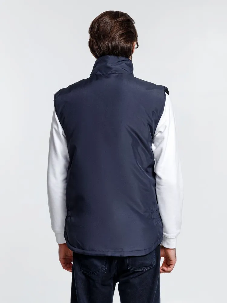 Мужской утепленный жилет с воротником-стойкой и удлиненной спинкой. Выполнен из ткани оксфорд с водоотталкивающим покрытием.