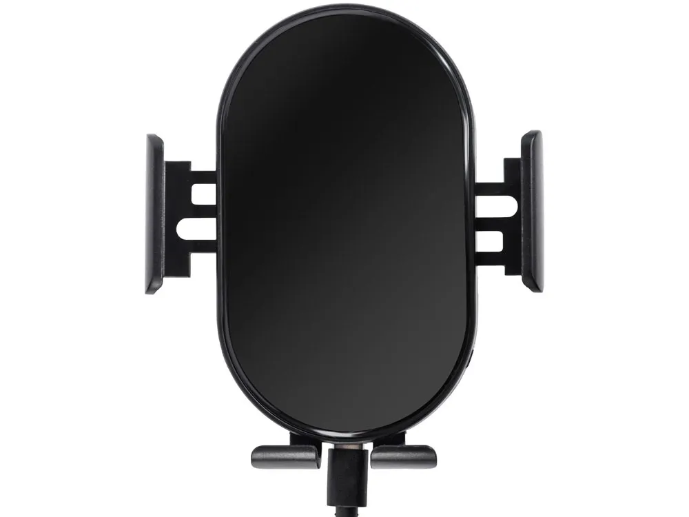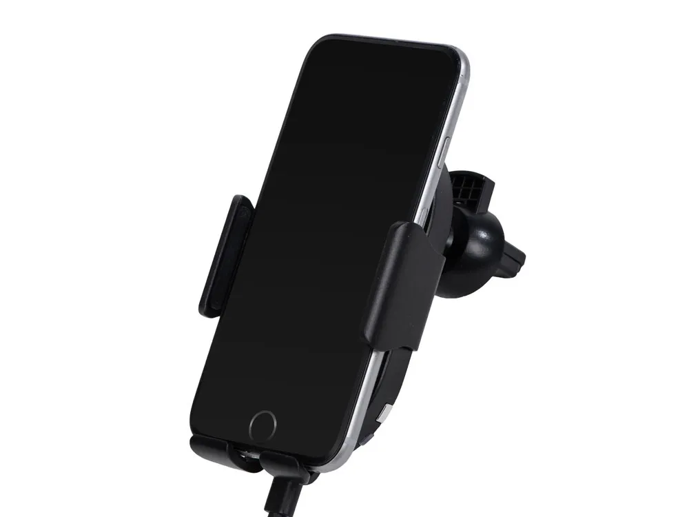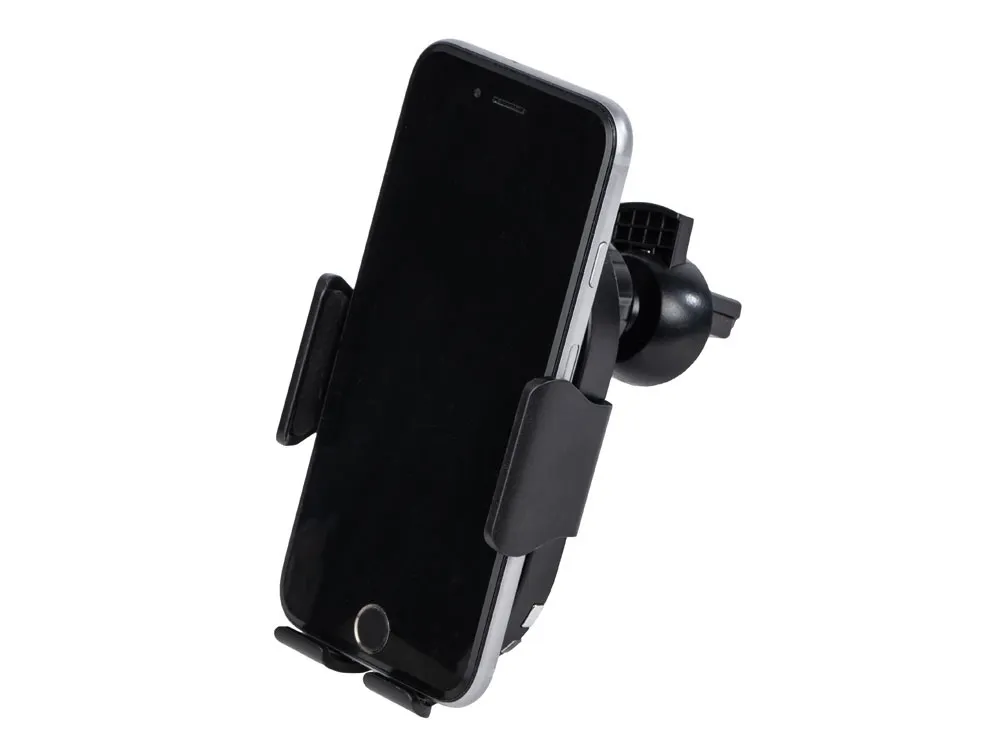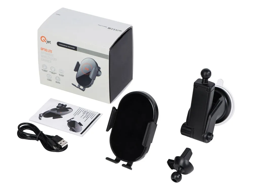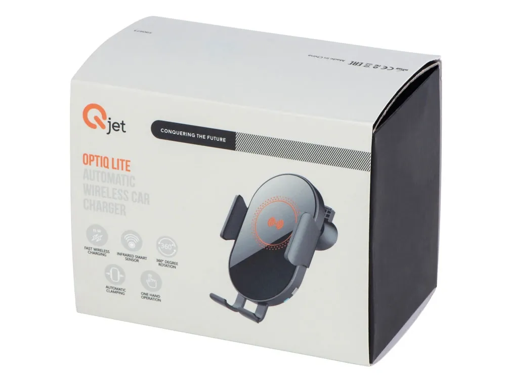 OptIQ Lite от Qjet — беспроводное зарядное устройство, которое автоматически фиксирует и надежно удерживает смартфон, когда вам нужно поместить его на зарядку одной рукой. Для этого коснитесь сенсорной кнопки на корпусе устройства справа или слева и поместите смартфон на нижнюю подставку зарядного устройства. Инфракрасный сенсор считывает присутствие смартфона на устройстве и дает сигнал держателям сдвинуться, после чего они надежно фиксируют телефон, самостоятельно подстраиваясь под его размер. Чтобы вынуть смартфон, прикоснитесь к сенсорной кнопке, которая разожмет боковые фиксаторы. Нижний держатель не даст вашему телефону выпасть, придерживая, пока вы не заберете его из OptIQ Lite. В комплекте передняя панель упакована отдельно от устройства. Рекомендуется перед первым использованием удалить с нее пленку и установить на фронтальную сторону устройства. Опционально при заказе на нее можно сделать большое полноцветное нанесение площадью 68*113 мм. Также в комплекте зарядный кабель USB-C длиной 100 см, крепление к вентиляционной решетке автомобиля, а также усиленное вакуумное крепление для плоских поверхностей или стекла. • позволяет пользоваться смартфоном одной рукой, не отвлекаясь от дороги • 2 сенсорных кнопки для открытия - слева и справа • автоматическое закрытие и калибровка боковых фиксаторов • быстрая беспроводная зарядка до 15 Вт • большая зона для УФ - печати логотипов • надежное вакуумное крепление с регулируемой ножкой в комплекте • зарядный кабель USB-С длиной 100 см