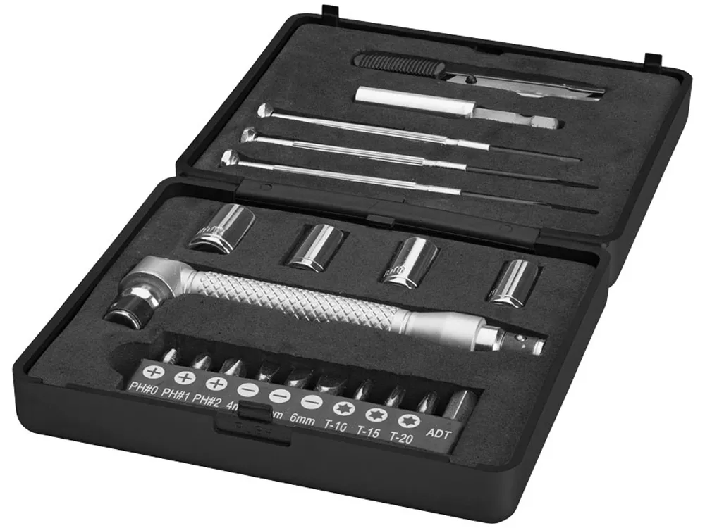 Набор из 20 инструментов в маленькой коробочке. В комплекте три отвертки, 10 насадок в холдере: три размера Philips (PH0, PH1, PH2) три плоских (4,5,6 мм), три звездочкой (Т10, Т15, Т20) и 1 адаптер; четыре ключа ( 7, 8, 9, 10 мм), один ножик, ручка и коннектор. Упакован в коробку STAC. АБС пластик.
