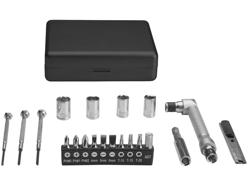 Набор из 20 инструментов в маленькой коробочке. В комплекте три отвертки, 10 насадок в холдере: три размера Philips (PH0, PH1, PH2) три плоских (4,5,6 мм), три звездочкой (Т10, Т15, Т20) и 1 адаптер; четыре ключа ( 7, 8, 9, 10 мм), один ножик, ручка и коннектор. Упакован в коробку STAC. АБС пластик.