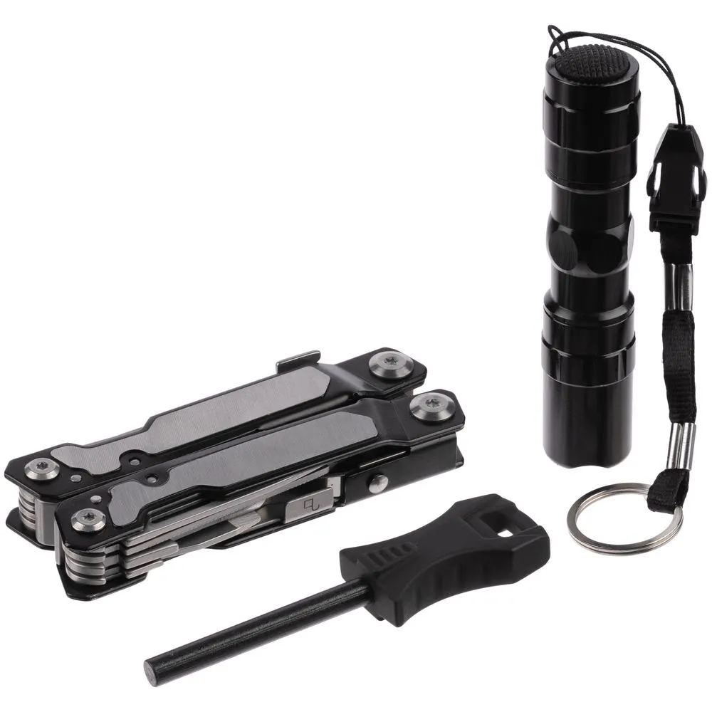 В комплекте чехол, фонарик (20 лм, работает от 1 батарейки типа АА 1,5 В, в комплект не входит) и огниво.