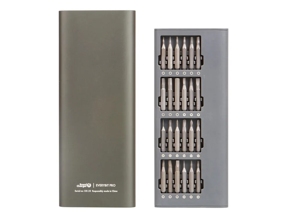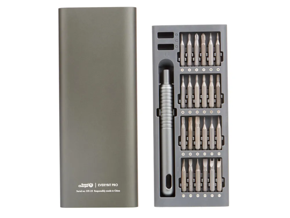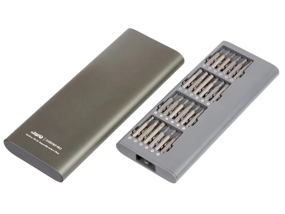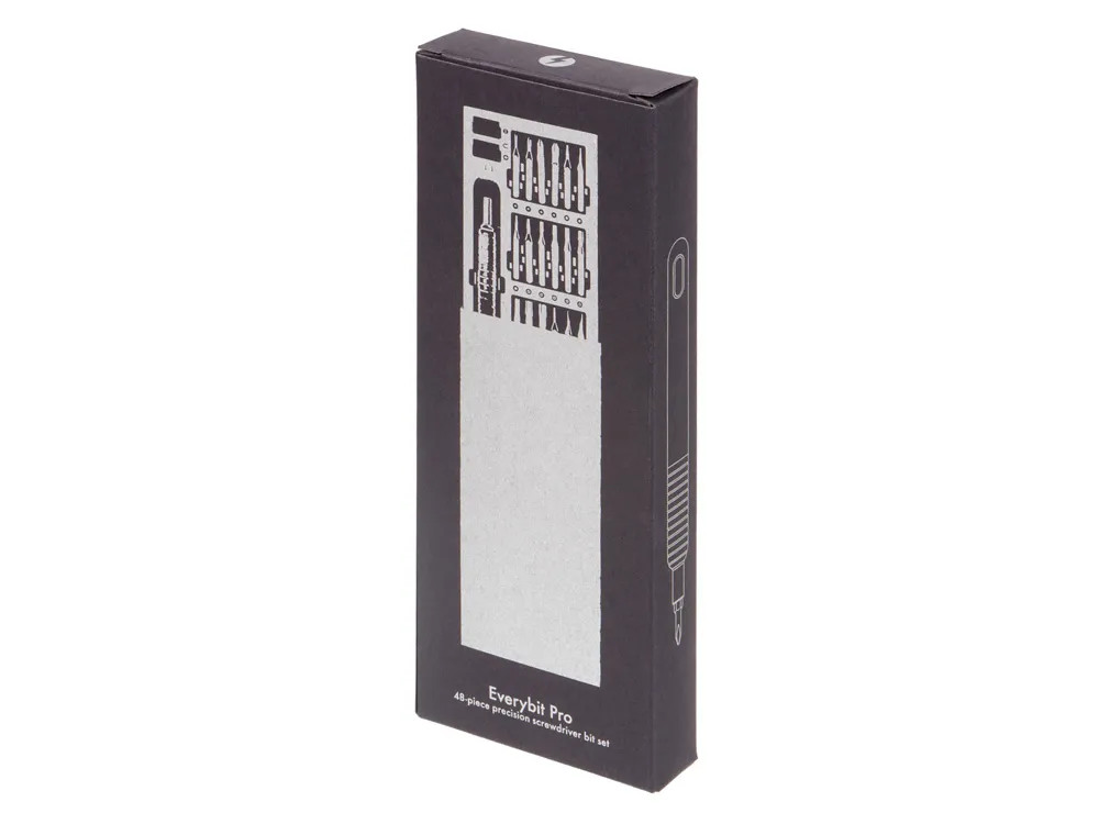 Набор прецизионных отверток Everybit Pro из 48 предметов изготовлен из промышленной стали марки S2. Подходит для ремонта смартфонов, айфонов, макбуков, айпадов, электроники, часов, фотоаппаратов, ноутбуков, очков, печатных плат, игрушек, ПК, игровых консолей и многого другого. Механизм открытия футляра — push-to-open, что означает следующее: для того, чтобы внутренняя часть футляра выдвинулась, необходимо аккуратно нажать на грань, находящуюся в углублении — после этого лоток с инструментами выдвинется сам. Обратите внимание на то, что для исправной работы механизма необходимо правильно размещать внутренний лоток при каждом использовании, в противном случае работа механизма будет нарушена, и для вынимания лотка понадобится встряхнуть футляр. Преимущество такого футляра — в его защите от внезапного открытия и повреждений содержимого. • Большое количество насадок • Магнитайзер для бит • Металлический кейс с защитным механизмом