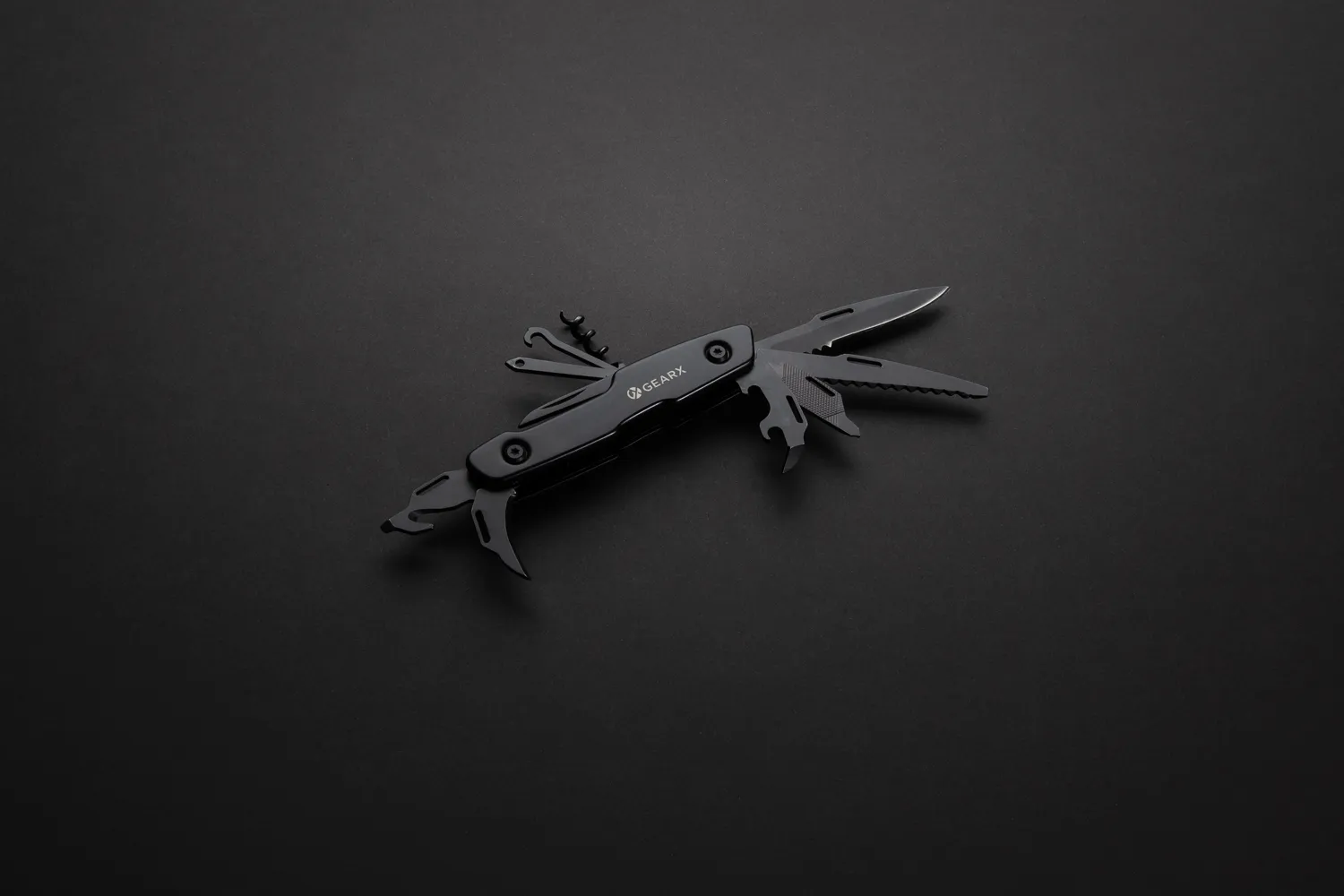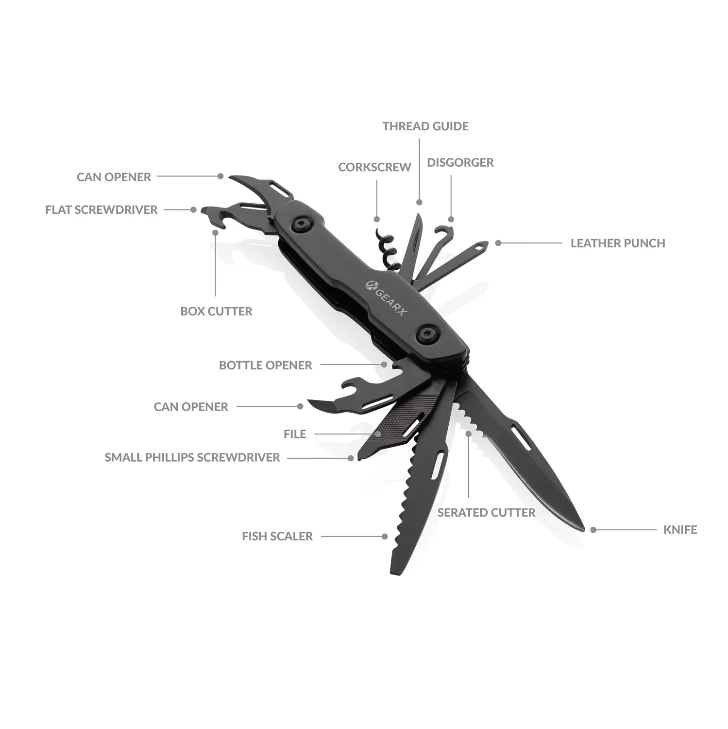 Компактный многофункциональный нож Gear X объединяет в себе самые необходимое инструменты. Черный алюминиевый корпус прекрасно сочетается с инструментами из нержавеющей стали премиум-класса 420. Включает в себя 13 функций: нож, пилу, шлицевую отвертку, консервный нож, напильник, маленькую отвертку Philips, отвертку Philips, штопор, нитенаправитель, дырокол, нож для коробок, открывалку для бутылок и маленькое лезвие. Карманный нож Gear X будет всегда под рукой и в любой момент готов к использованию. Поставляется в стильной подарочной коробке.