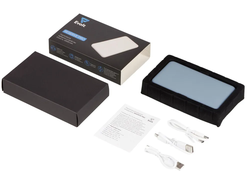 Универсальный внешний аккумулятор "Reserve Pro" обладает надежной литий-полимерной батареей класса "А" емкостью 10000 мАч и размерами меньше современного смартфона. Корпус выполнен из качественного ABS-пластика с анти скользящим приятным покрытием soft-touch. В корпусе находятся три самых популярных входных разъема (USB Type C, micro USB, Lightning), что значит можно использовать один кабель для зарядки и повербанка, и Вашего смартфона. Разъем USB-C также работает на выход, поэтому повербанк может заряжать до 2-х устройств одновременно. В комплекте кабели micro USB, Lightning и симметричный USB-C - USB-C. Многоуровневая система защиты от скачков напряжения, короткого замыкания, перегрева и перезаряда. -Меньше современного смартфона -Покрытие софт-тач -Универсальный: 3 входных разъема и 2 выходных разъема -Многоуровневая интеллектуальная система защиты для безопасной зарядки -Большая емкость батареи подойдет для нескольких зарядок современного смарфтона и других гаджетов