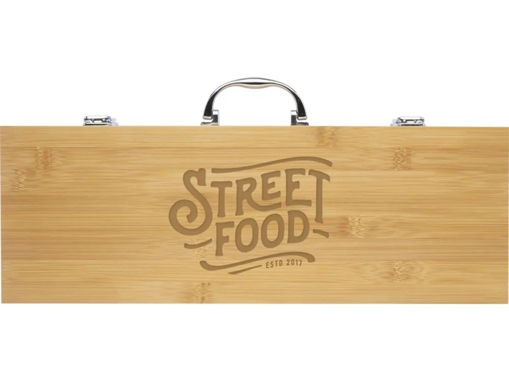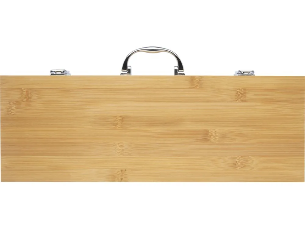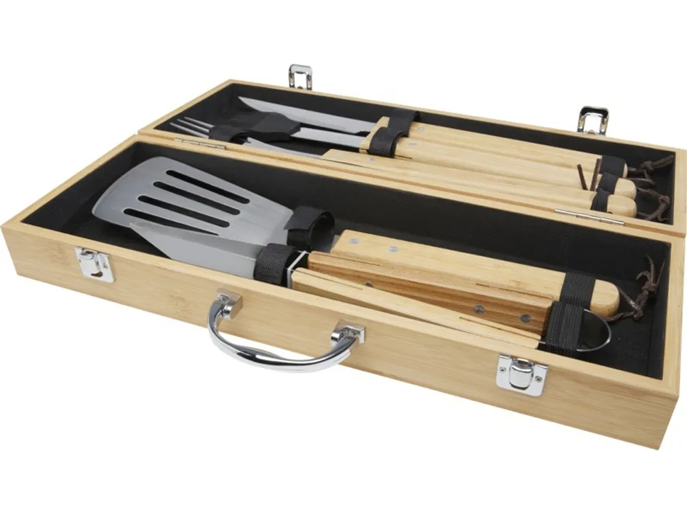 Набор для барбекю из 5 предметов из бамбука: лопатка (40 x 9,5 см), щипцы (34,5 x 6 см), вилка (38,5 x 3 см), нож (38,5 x 3 см) и щетка (38 x 4,3 см). Набор поставляется в подарочной коробке из бамбука (46 x 16,2 x 7,4 см). Ручки и подарочная коробка изготовлены из бамбука, который производится в соответствии со стандартами устойчивого развития.