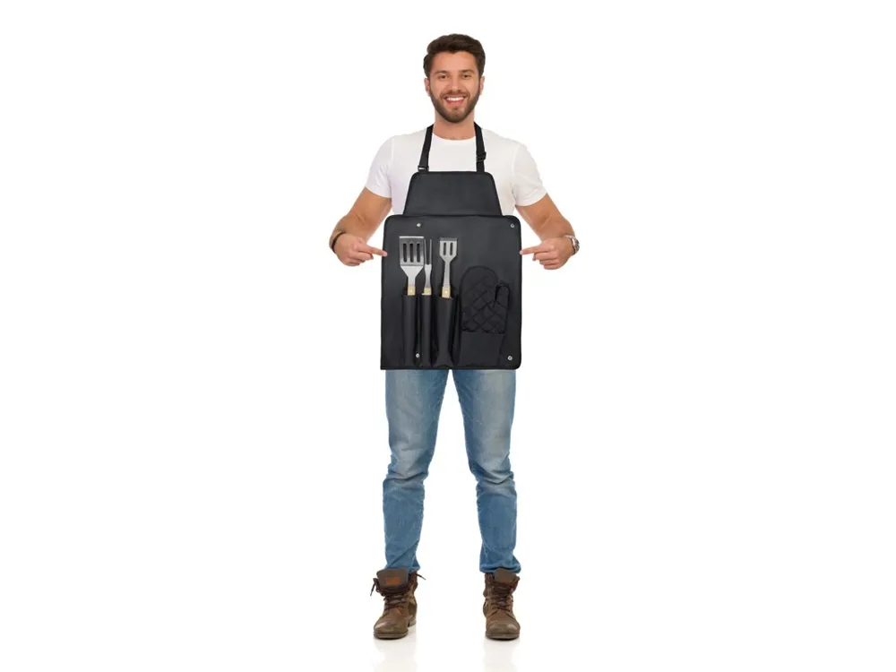 Набор для барбекю из 5 предметов: лопатка (36,5 x 7 см), вилка (36,5 x 2 см), щипцы (36,5 x 5 см), перчатка (25 x 16 см) и фартук с сумкой (42 x 60 см). Ручки сделаны из бамбука, который добывается и производится в соответствии со стандартами устойчивого развития.