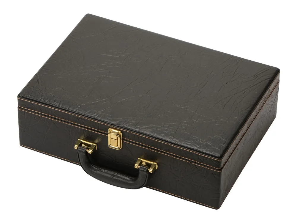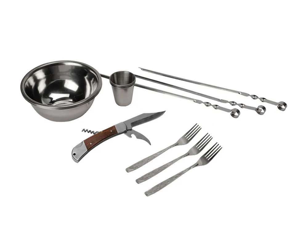 Кейс из сплит-кожи, с повышенной износостойкостью, внутренняя отделка натуральная кожа с художественным выжиганием. В комплекте: -стопка нерж. сталь 70мл- 3шт, -вилка столовая нерж. сталь- 3шт, -миска нерж. сталь 500 мл- 3шт, -шампура нерж. сталь 35 см- 3шт, -многофункциональный нож.