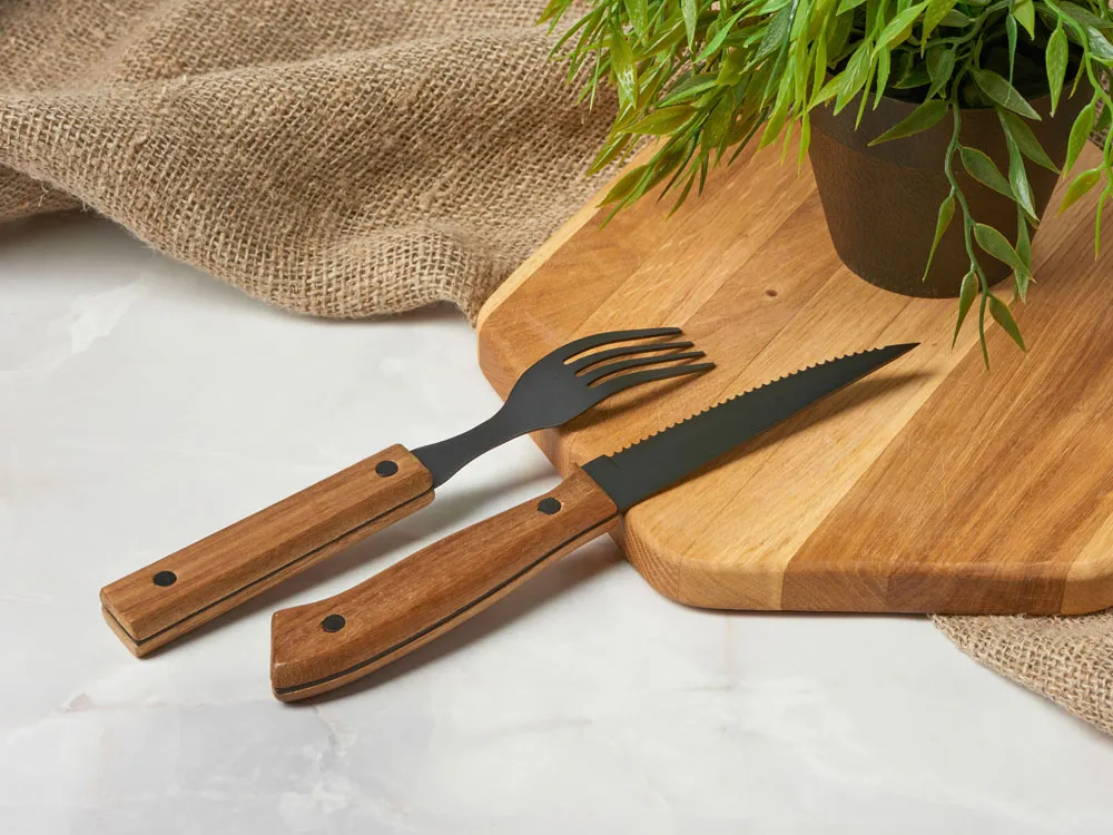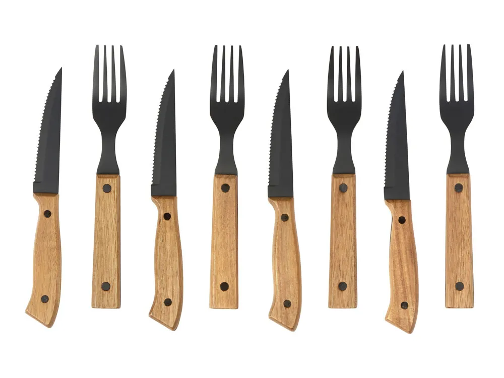 Набор приборов для стейка от бренда Tour de Grass выполнен из нержавеющей стали, обеспечивающей качество вилок и ножей в комплекте, а ручки приборов — из акации, которая также славится своей прочностью и долговечностью и точно не даст обжечься. Древесина акации устойчива к растрескиванию и не боится контактов с пищей. Remy — незаменимая вещь при выезде на природу, подойдёт как для стейков и шашлыка, так и для барбекю. В комплект входят приборы на 4 персоны (4 вилки и 4 ножа). Минималистичный дизайн позволяет органично вписать Ваш логотип. - изготовлен из нержавеющей стали и акации; - количество приборов — 8 шт., 4 комплекта (4 вилки и 4 ножа); - износостойкие и долговечные материалы. Вся линейка товаров бренда Tour de Grass для пикника выполнена в едином стиле, что позволяет сочетать их между собой, формируя гармоничные сеты для приготовления и отдыха на свежем воздухе.