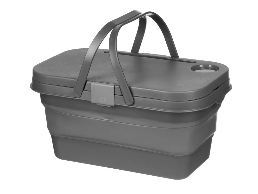 Крышка этой корзинки для пикника превращается в удобный столик буквально по щелчку пальцев: для этого нужно просто снять ее и разложить металлические ножки. На этом магия корзинки не заканчивается — силиконовый корпус складывается, что очень удобно, когда пикник закончен, и все содержимое съедено. Корзинку легко мыть, удобно переносить, занимает мало места в сложенном виде. - ниша для стакана и приборов на крышке-столике - идеально для пикников - удобные ручки для переноски - вместительная в разложенном виде, экономит место при хранении