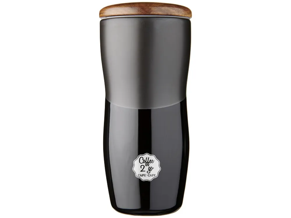 Двустенная керамическая термокружка Reno объемом 370 мл. Двустенная керамическая термокружка с контрастным дизайном из матового и блестящего покрытия. Кроме того, двустенная керамическая конструкция препятствует образованию конденсата на внешней стороне стакана. Оснащена деревянной нажимной крышкой. Номинальный объем кружки 370 мл, при использовании крышки максимальный полезный объем составит 335 мл.