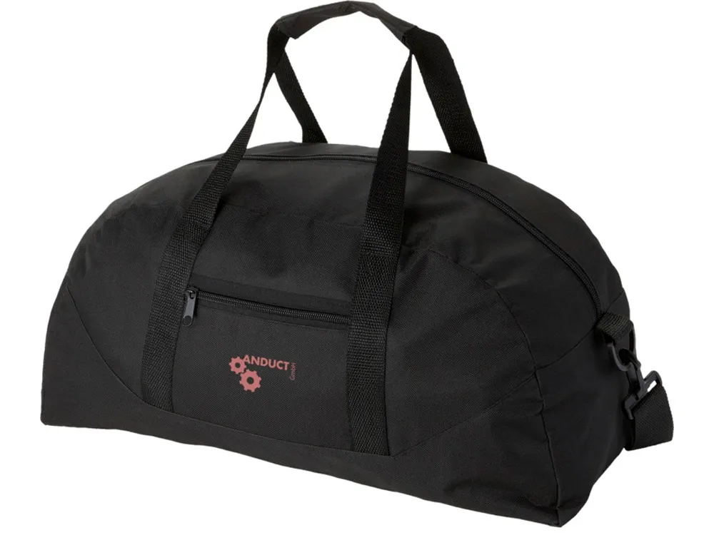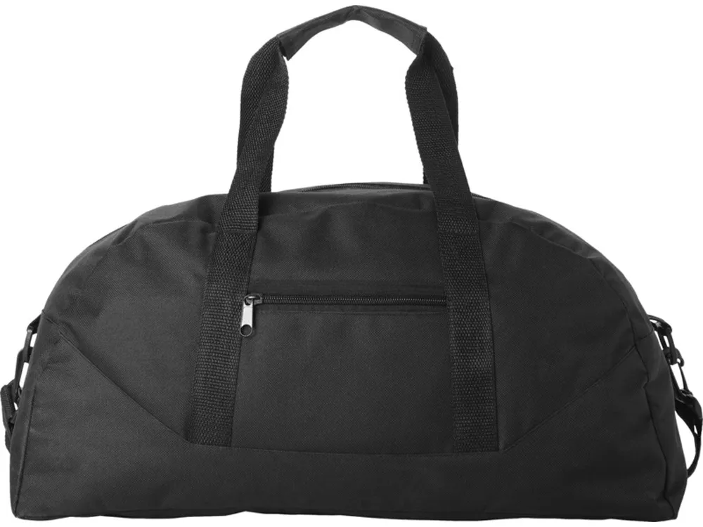 Основное и переднее отделение на молниях. Две усиленные ручки. Регулируемый плечевой ремень, максимальная длина 110 см.