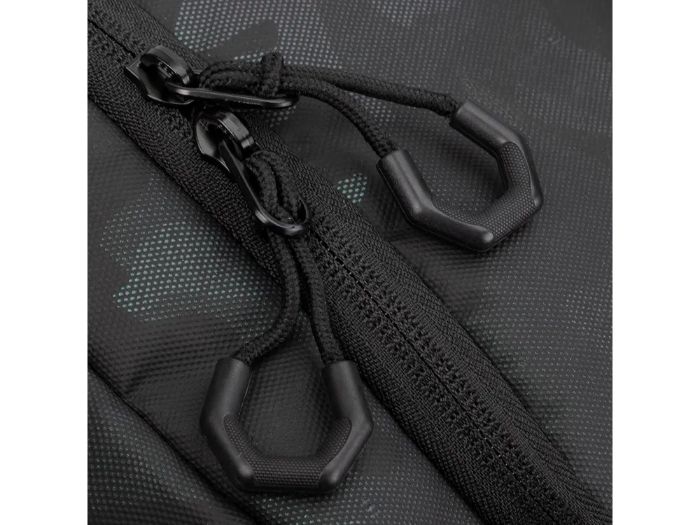 Выполнена из высококачественной водоотталкивающей ткани с ламинированием. • U-образный клапан на молнии для легкого доступа в основное отделение. • Внутренний сетчатый карман на молнии для паспорта, бумажника. • Внешний карман на молнии для смартфона. • Съемный плечевой ремень
