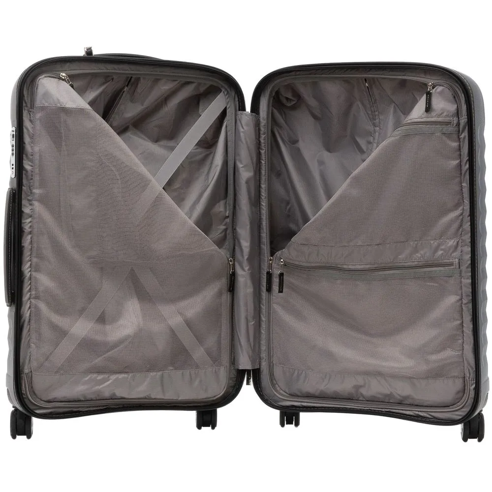 Чемодан E-Lite изготовлен из ударостойкого поликарбоната с интересной ребристой фактурой — смотрится эффектно, а еще противостоит появлению царапин и выгоранию, сохраняя первозданный внешний вид изделия долгое время.
