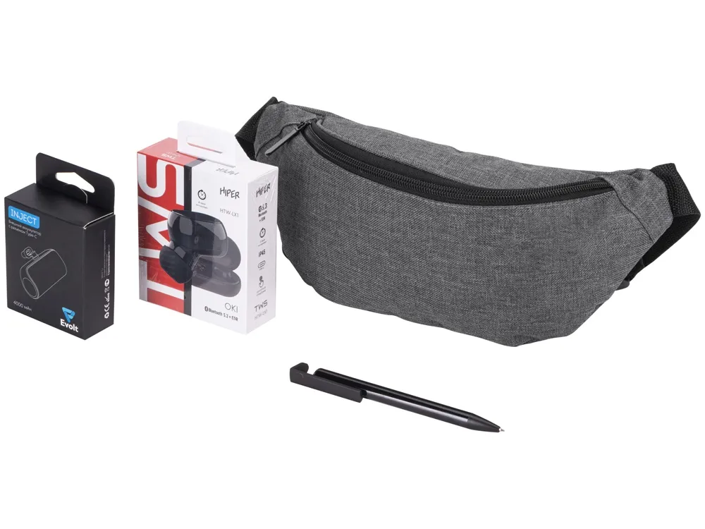 Портативное зарядное устройство поможет вам всегда оставаться на связи, куда бы вы ни отправились. Аккумулятор подходит для работы со смартфонами, планшетами, наушниками, а также другими девайсами, имеющими интерфейс USB-C. Для подключения не понадобится дополнительный кабель, ведь аккумулятор обладает встроенным разъемом USB-C. Беспроводные стерео наушники сочетают в себе функциональность, отличный звук и привлекательный дизайн. Чехол-зарядка оснащён индикатором заряда. Шариковая ручка подойдёт не только для записей, её также можно использовать как компактную подставку для смартфона. Незаменимый спутник в поездках - поясная сумка, выполненная из прочной ткани. Внутренний карман на молнии поможет защитить всё самое ценное. • ёмкость аккумулятора: 4000 мАч • время активной работы наушников - более 3 часов от одного заряда • идеальный набор для поездок и путешествий