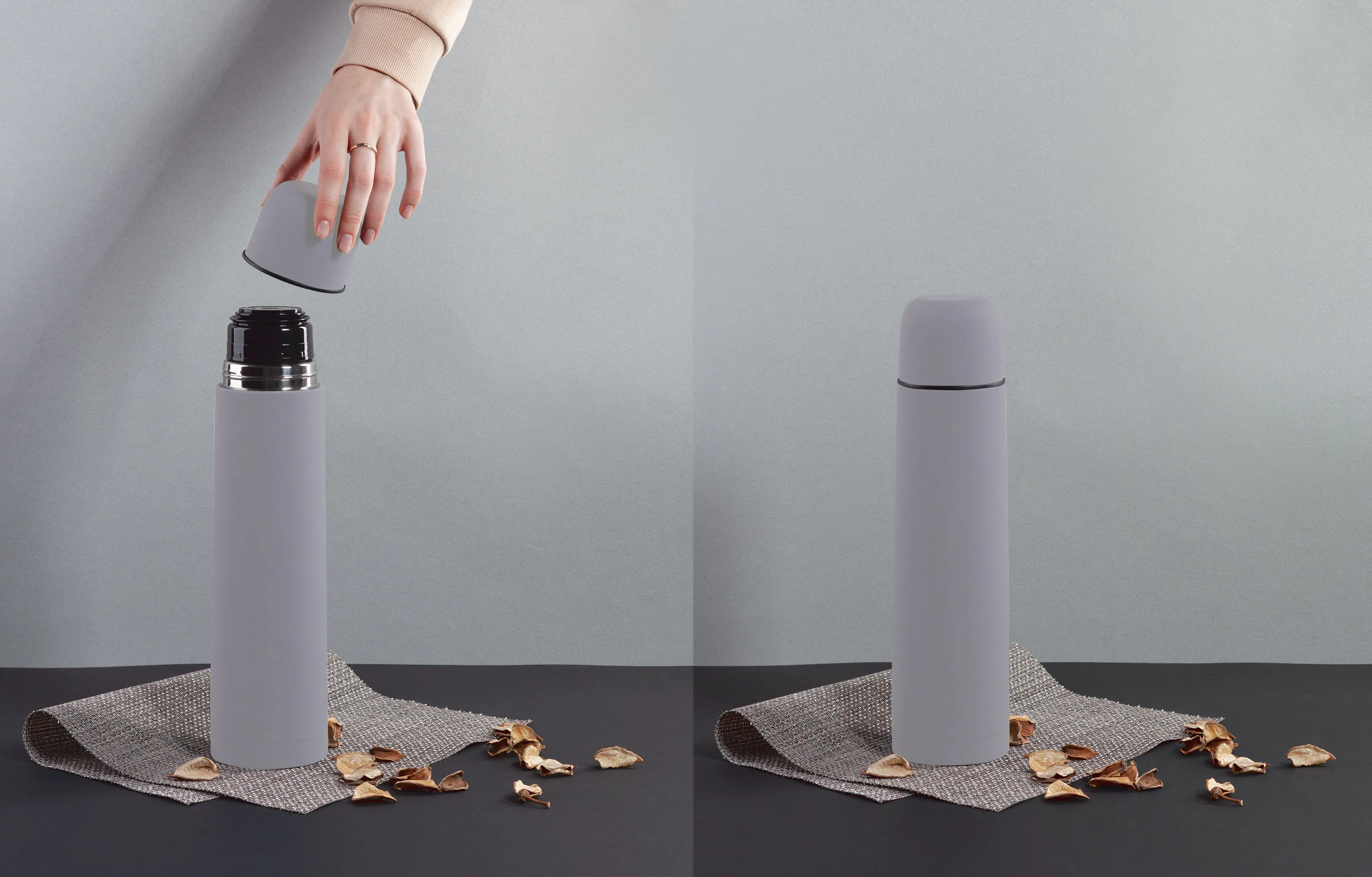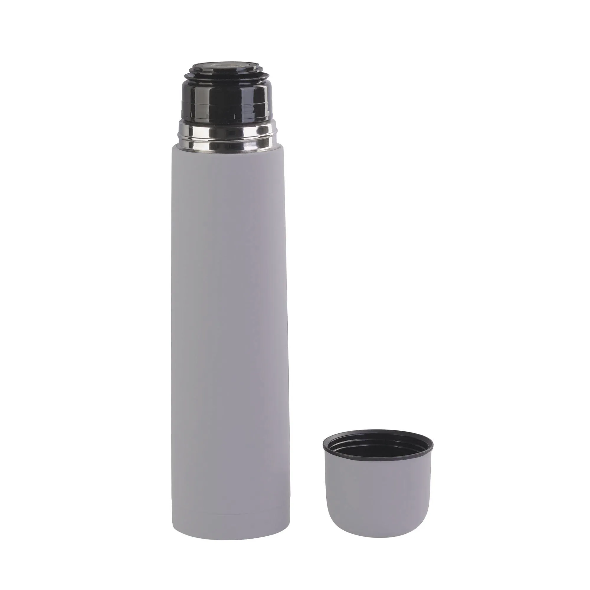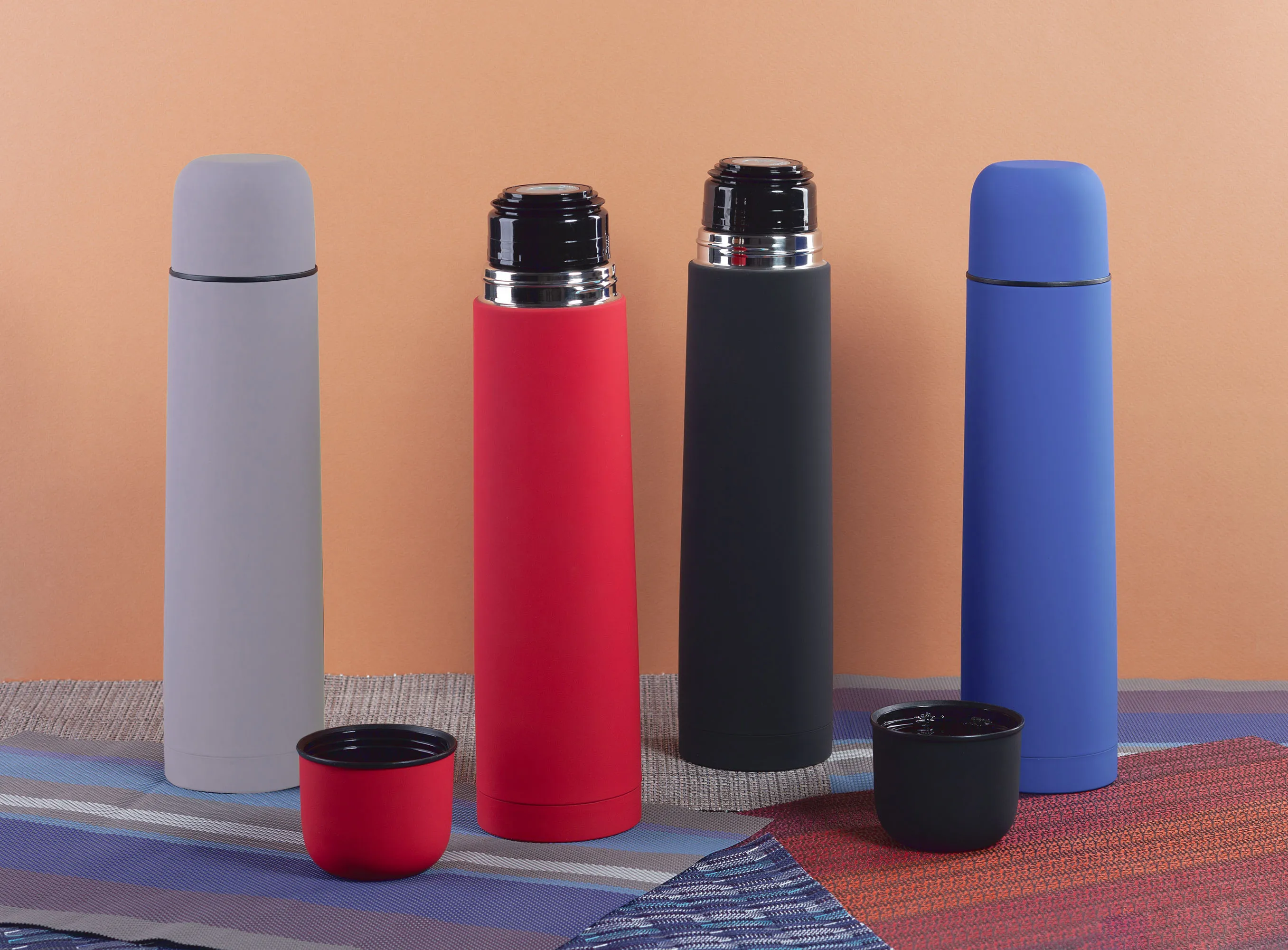 Внешняя стенка термостакана изготовлена из нержавеющей стали с уникальным прорезиненным напылением soft-touch, а внутренняя стенка выполнена из высококачественной пищевой, нержавеющей стали. Корпус изделия персонализируется по окружности встык. Термос оснащен пробкой с клапаном, которая позволяет наливать напиток одним нажатием.