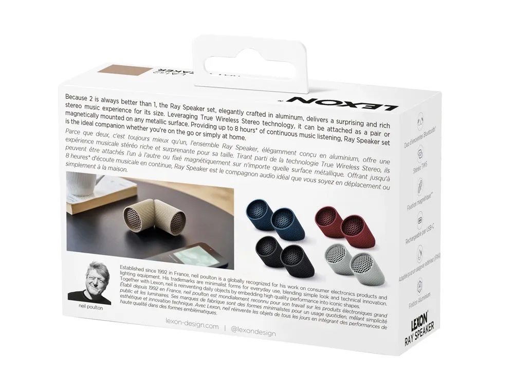 Ray Speaker — это дуэт магнитных Bluetooth®-колонок, удостоенных наград Red Dot Design Award и IF Design Award. Обеспечивая захватывающий стереозвук благодаря технологии True Wireless Stereo, эти колонки легко крепятся друг к другу или к любой магнитной поверхности, что делает их идеальными для использования дома или в дороге. Помимо прослушивания музыки, Ray Speaker позволяет совершать звонки без помощи рук и дистанционно делать селфи. Благодаря аккумулятору, работающему до 8 часов, и элегантному алюминиевому корпусу, они добавят современный штрих в ваш интерьер, а степень водонепроницаемости IPX4 позволяет использовать их на улице. Доступны различные цвета, которые дополнят ваш стиль. - Комплект магнитных колонок Bluetooth® - Совместимость с TWS для стереозвучания - Микрофон - Кнопка для селфи - Водозащита IPX4 - Время работы: до 8 ч - Время зарядки: 3 ч - Зарядка через кабель USB-C
