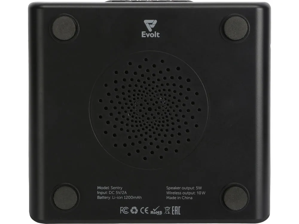 Беспроводная колонка с часами и функцией беспроводной зарядки Sentry от Evolt. Устройство может работать автономно, что позволяет использовать его в любой точке квартиры и за ее пределами и избавиться от проводов на рабочем столе. Колонка подключается к смартфону при помощи Bluetooth, имеет большой динамик, занимающий собой всю нижнюю панель Sentry. Передняя зеркальная панель выступает в роли циферблата: во включенном виде на ней проявляются цифры и статусы. При настройке будильника вы можете выбрать одну из пяти мелодий или установить радио в качестве сигнала. Sentry предусматривает возможность установки двух будильников на разное время, а также можно повторить сигнал через 5 минут. Колонка заряжается от сети, при подключении к ней Sentry можно использовать беспроводную зарядку: положите ваш смартфон поверх колонки, и устройство автоматически начнет заряжаться. В автономном режиме функции беспроводной зарядки и радио не активизируется в целях сохранения батареи. - беспроводная, работает автономно - радио - интересный дизайн с зеркальным дисплеем - будильник с 5 мелодиями, возможно добавить 2 будильника на разное время, удобная кнопка повтора сигнала через 5 минут - большой динамик - функция беспроводной зарядки