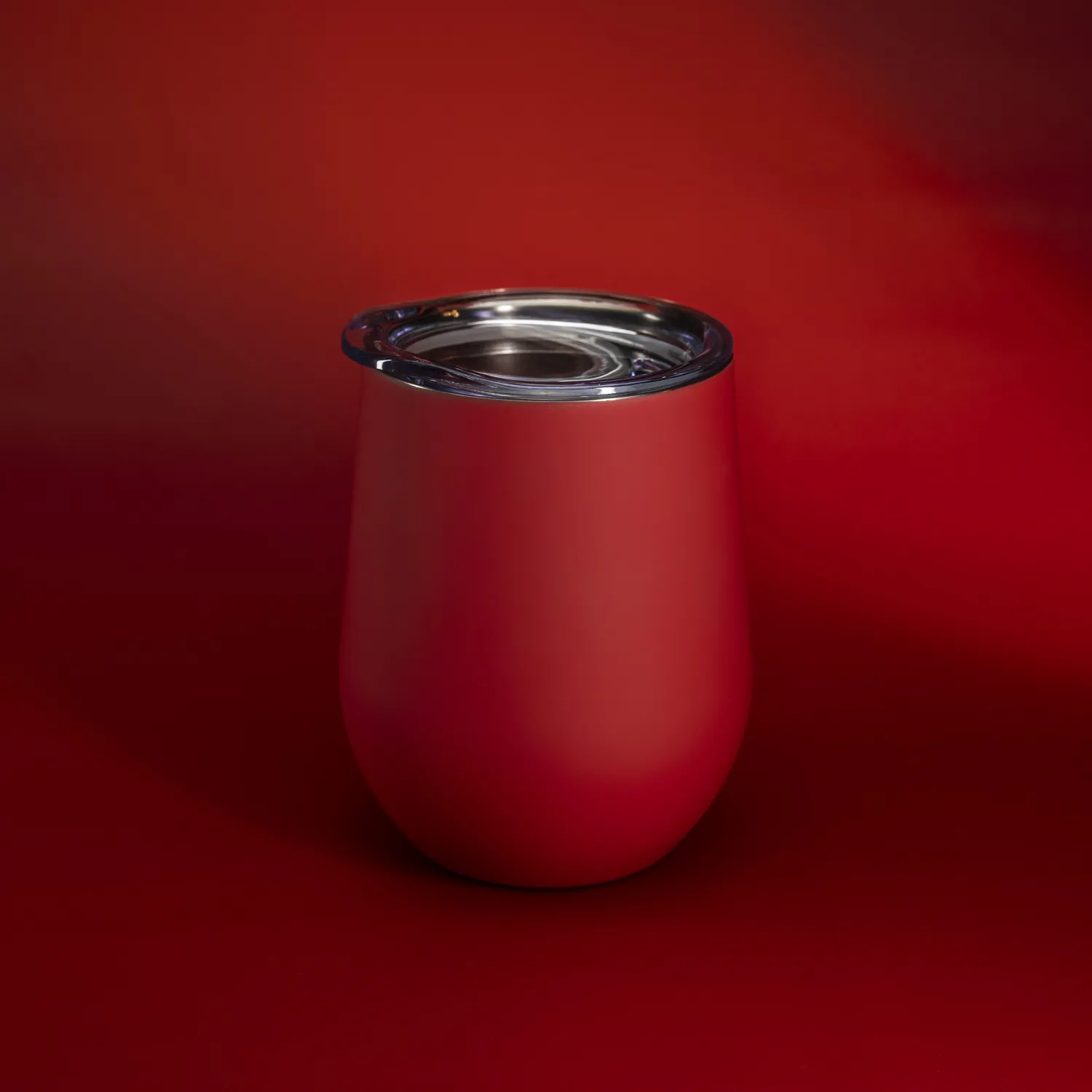 Кофер с тактильно приятным покрытием софт-тач имеет двойные стенки из нержавеющей стали и пластиковую крышку с эргономичным отверстием.