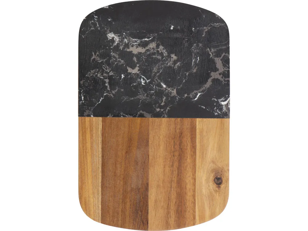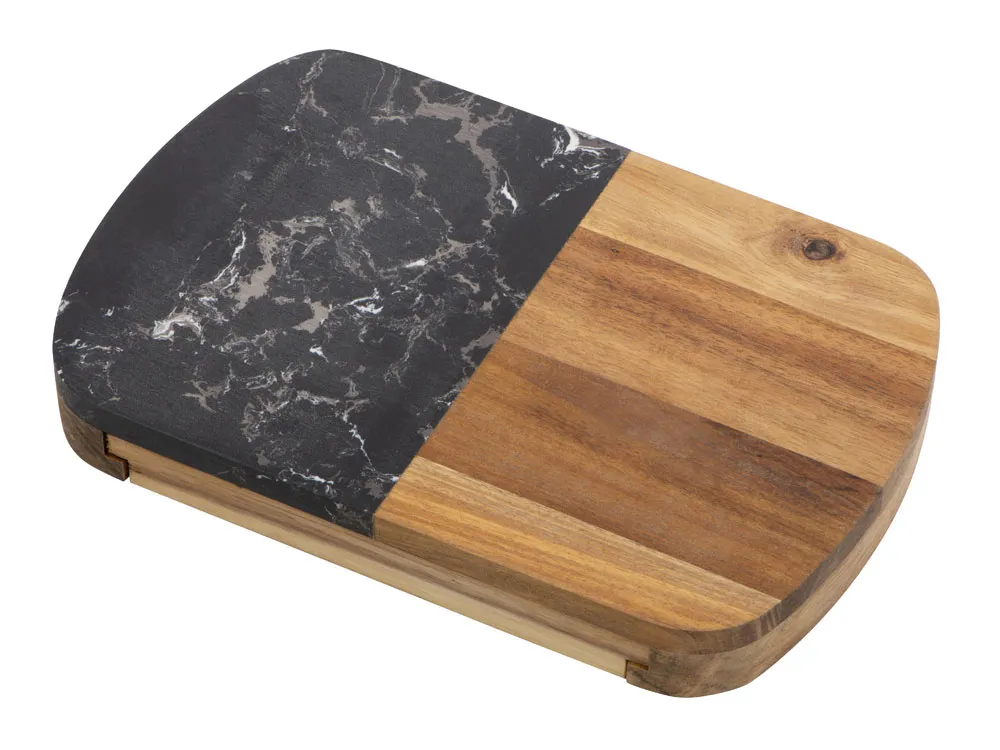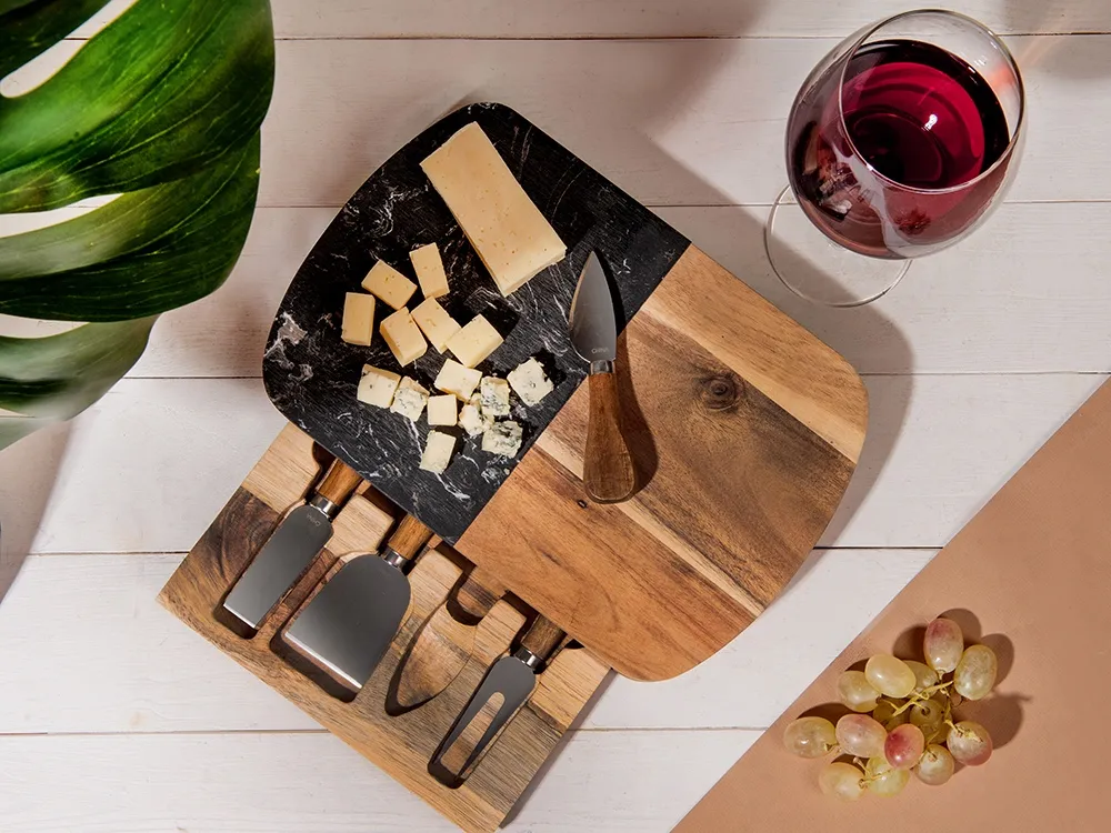 Этот роскошный набор для сыра идеально подходит на роль подарка для любого торжественного случая. Набор изготовлен из черного мрамора и акации: каменная вставка на крышке выполняет не только декоративную, но и практическую функцию, ведь на ней очень удобно резать и раскладывать сыр. Инструменты для резки сыра хранятся в выдвижном ящике под крышкой, для каждого из приспособлений предусмотрена своя вырубленная ниша. Из-за особенностей материала возможны вариации рисунка мрамора и дерева, что может отразиться на выгравированном изображении.