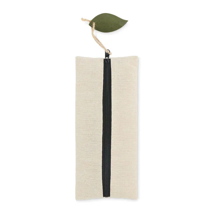 Набор канцелярских принадлежностей в мешочке из джута и хлопка, включающий деревянную линейку 15 см, деревянный карандаш, шариковую ручку с бумажным корпусом, ластик и деревянную точилку.