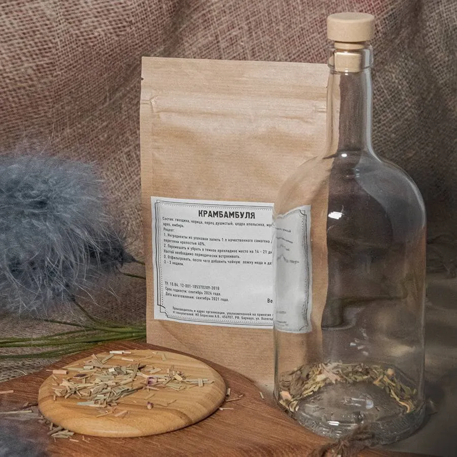 Набор для приготовления 1 литра Зубровки. В состав набора входят: - набор трав и специй "Зубровка" (трава зубровка, чабрец, липовый цвет, кориандр, декстроза), - бутылка 1 л, - пробка Т-образная, - стружка бумажная, - коробка подарочная арт. 34930, размер 30 х 25 х 15 см