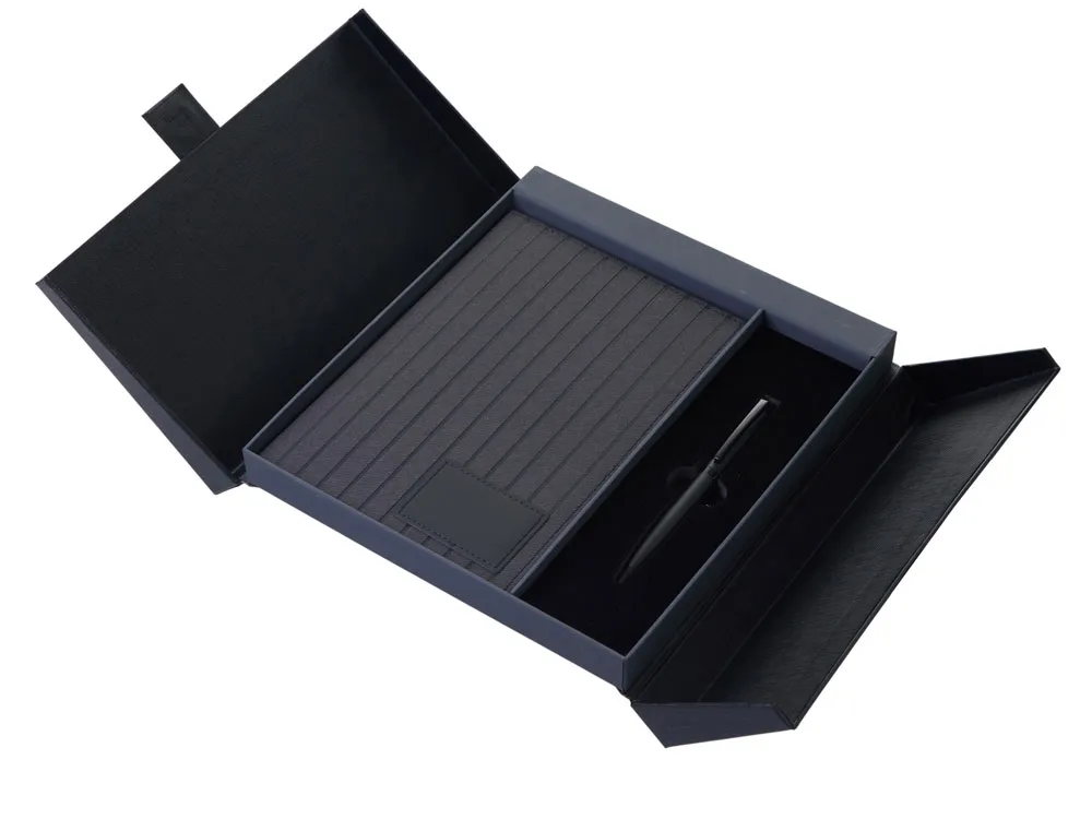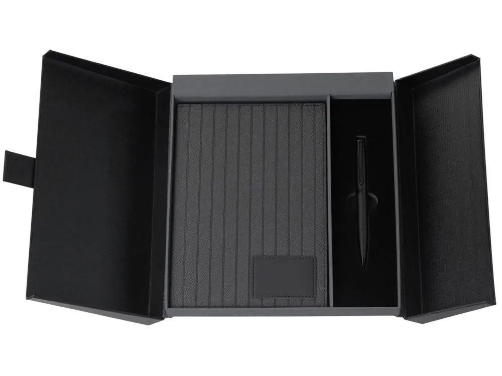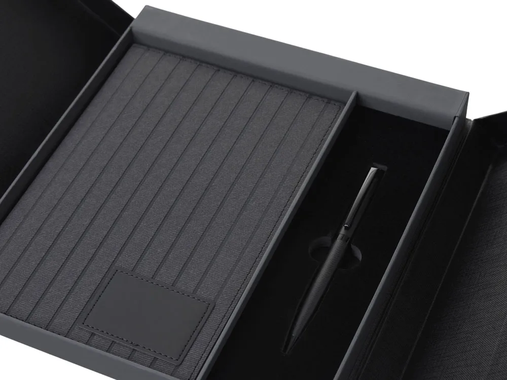 "Bradbury & Co" - это элегантный подарочный набор, упакованный в красивую коробку на магните. Внутри — блокнот в обложке из рифленой экокожи и металлическая шариковая ручка. Ручка гармонирует с блокнотом за счет рифленой нижней части, а блокнот имеет специальный патч для нанесения логотипа (который можно также нанести на более ровную поверхность на обороте блокнота) и ляссе-закладку для удобства. При гравировке на ручке вскрывается эффектный серебристый цвет. Внутри блокнота - 80 листов кремовой бумаги 80 г/м2 с FSC-сертификатом ответственного лесопользования. Стержень ручки заправлен синими немецкими чернилами Dokumental и швейцарским пишущим узлом Premec, что обеспечивает мягкость и плавность письма.