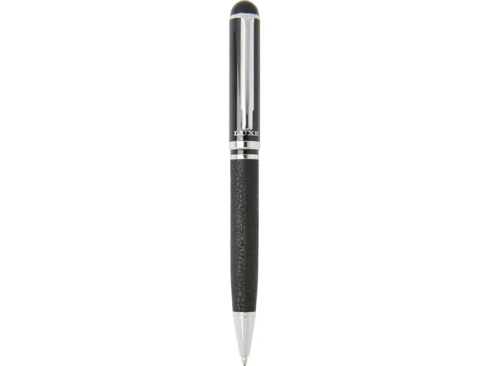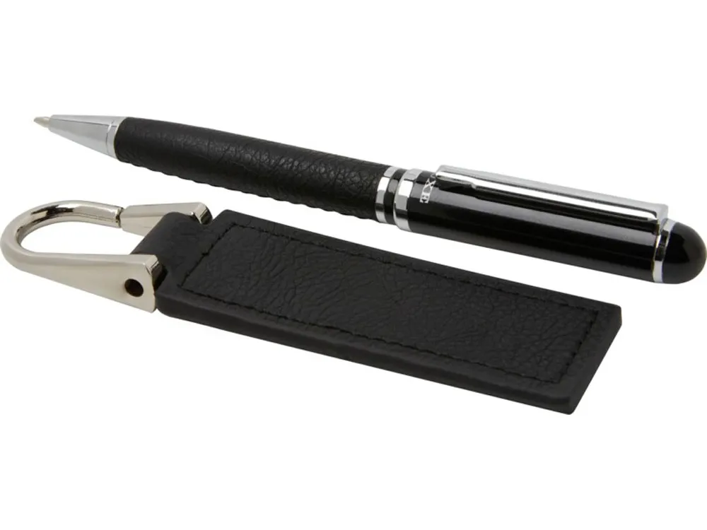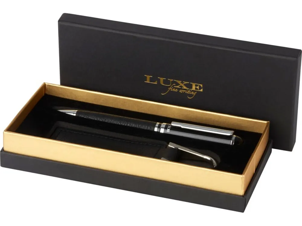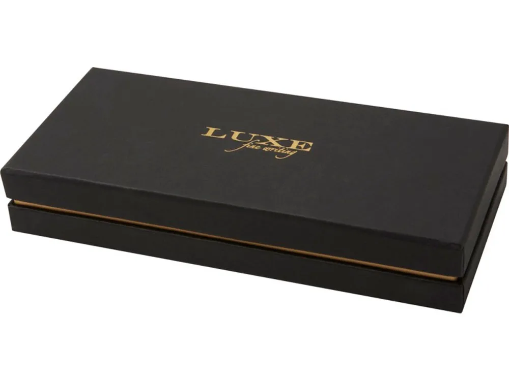 Подарочный набор включает шариковую ручку и брелок-петлю с элегантным дизайном. Шариковая ручка предварительно заполнена синими чернилами. Упакована в подарочную коробку LUXE. Латунь, PU пластик.