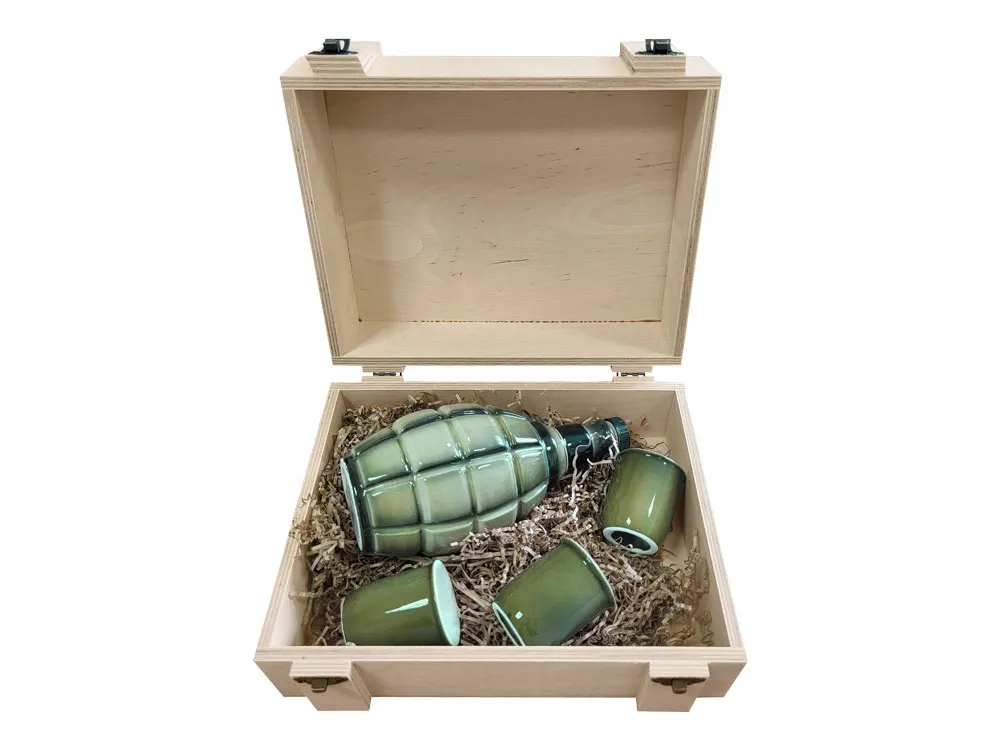 День Победы - один из самых важных и памятных государственных праздников в нашей стране. В этот знаковый для России день принято дарить памятные сувениры. Подарочный набор "День Победы" - это великолепный подарок на 9 мая, который запомнится надолго. В оригинальном деревянном “гранатном” ящике находятся керамические боеприпасы: штоф в виде гранаты и три стопки. Все сувениры изготовлены из высококачественного материала, поэтому они прослужат долго и будут радовать глаз. Этот подарочный набор станет прекрасным дополнением к праздничному столу. Внимание! Данное изделие относится к категории повышенной хрупкости. Для обеспечения его целостности и безопасной транспортировки настоятельно рекомендуется использование обрешетки. Обрешеточная упаковка является обязательной при доставке, и компания Oasis не несёт ответственности за повреждения, возникшие в результате ненадлежащей упаковки или транспортировки без обрешетки.