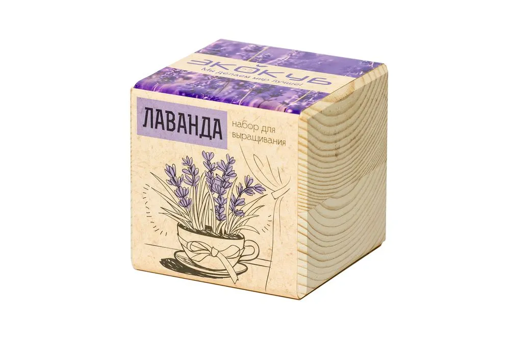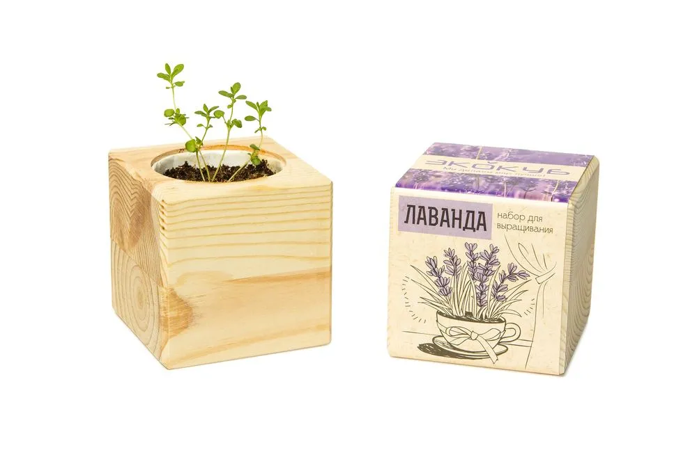В наборе: деревянный куб, грунт, семена лаванды.