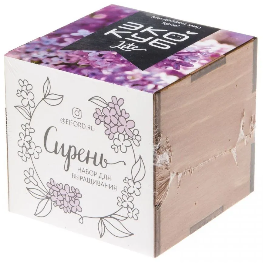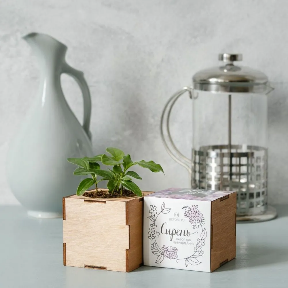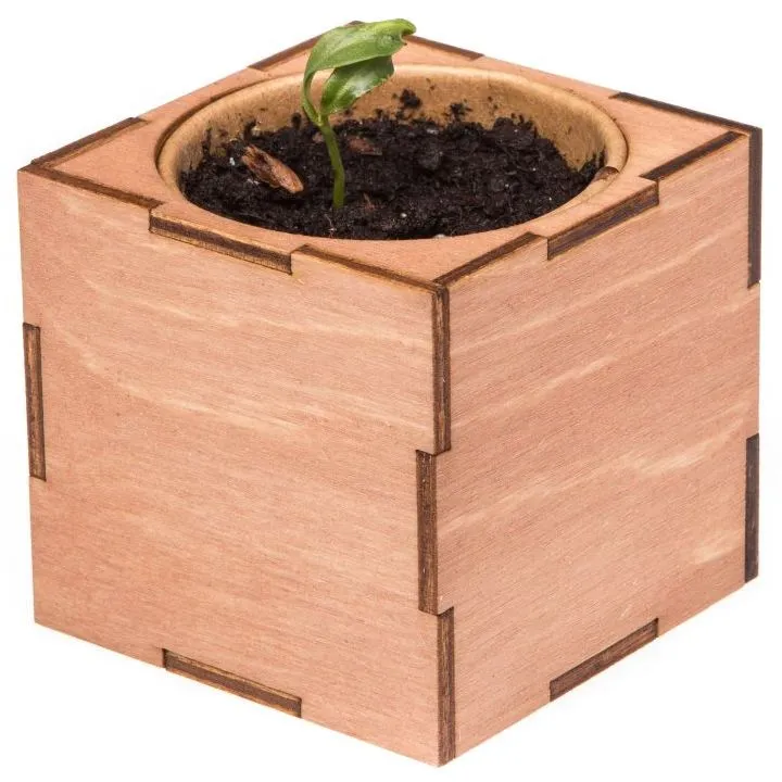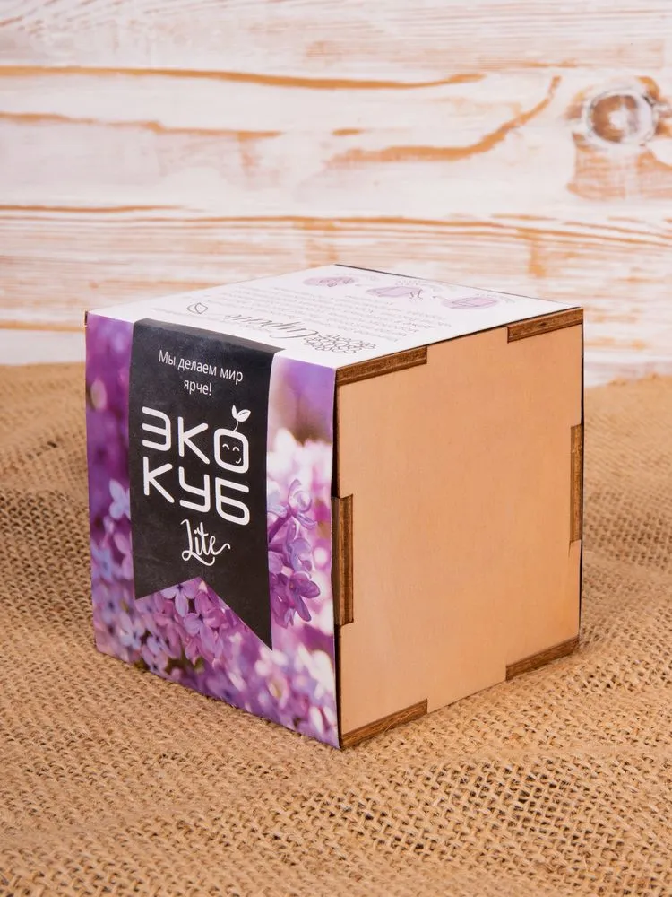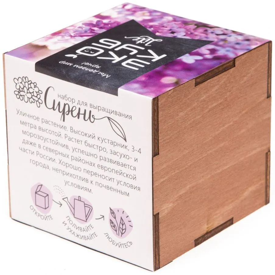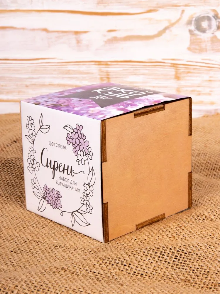 В наборе: деревянный куб, бумажный стаканчик, питательный грунт, семена, вермикулит.