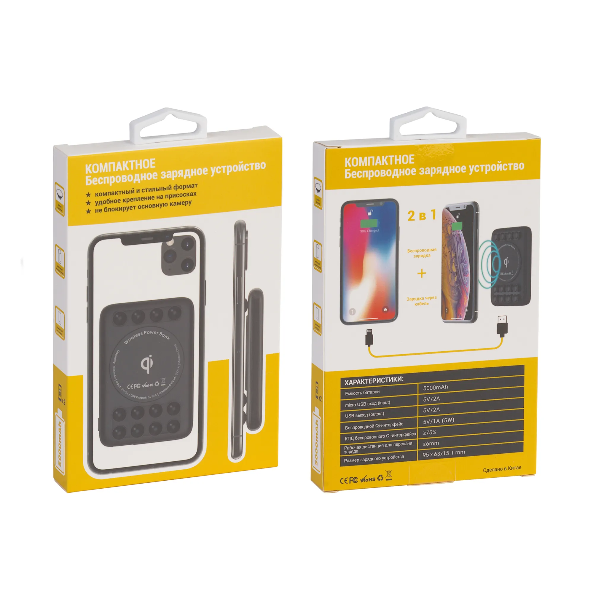Компактное беспроводное зарядное устройство емкостью 5 000 mAh легко фиксируется на задней панели мобильного телефона с помощью присосок. При беспроводном/проводном соединении аккумулятор не закрывает обзор основной камеры (на большинстве современных моделей) - таким образом сохраняется возможность снимать фото/видео во время подзарядки. Зарядку можно остановить принудительно, выключив аккумулятор двойным нажатием на кнопку питания. При этом зарядное устройство не обязательно откреплять от смартфона. Когда вновь потребуется зарядка, достаточно будет нажать на кнопку питания.