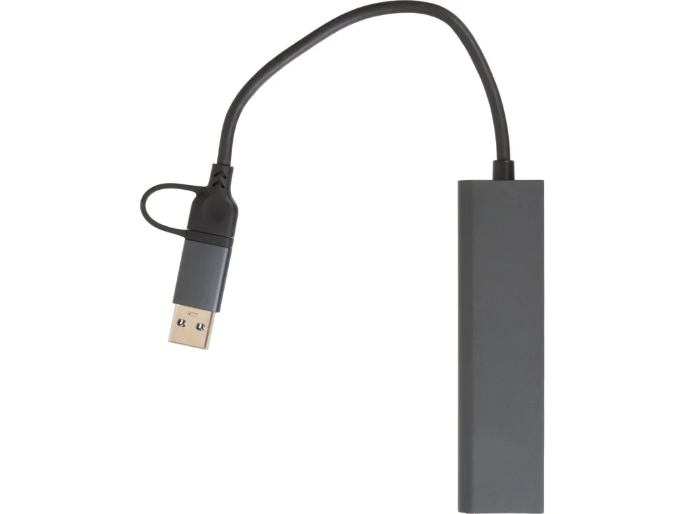 USB-хаб «Command» — это компактное и стильное решение для расширения возможностей вашего устройства. Благодаря универсальному коннектору 2-в-1 (USB-C и USB-A), он совместим с широким спектром современных гаджетов, включая ноутбуки, смартфоны и планшеты. Этот хаб станет незаменимым помощником для тех, кто ценит функциональность и минимализм. Четыре высокоскоростных порта: 2 x USB-A 2.0: идеально для подключения периферийных устройств, таких как мыши, клавиатуры или флеш-накопители. 1 x USB-A 3.0: обеспечивает быструю передачу данных со скоростью до 5 Гбит/с, что делает его подходящим для внешних жестких дисков и других устройств, требующих высокой пропускной способности. 1 x USB-C 3.0: поддерживает современные устройства с интерфейсом USB-C, обеспечивая надежное подключение и зарядку . Универсальный коннектор 2-в-1 (USB-C и USB-A): Устройство легко подключается к любому устройству с портом USB-C или USB-A, что делает его максимально универсальным и удобным для использования в различных сценариях. Стильный алюминиевый корпус: Хаб выполнен в цвете ""space gray"", который гармонично сочетается с современными гаджетами. Прочный алюминиевый корпус не только обеспечивает долговечность, но и придает устройству элегантный внешний вид.