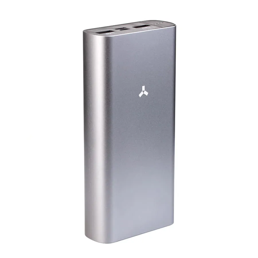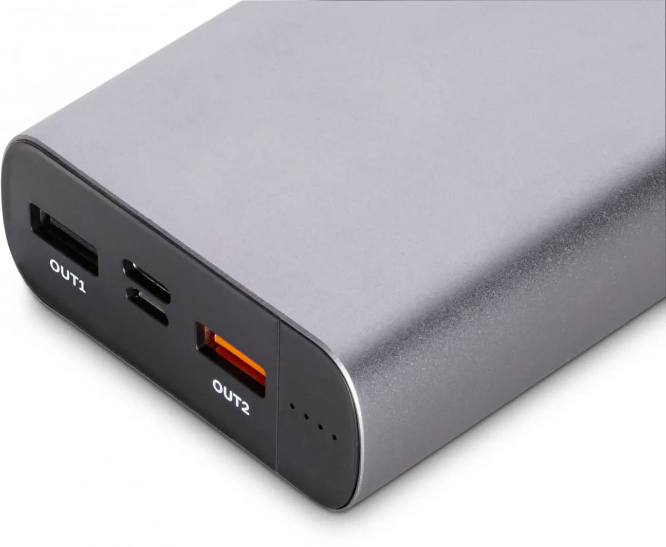 Мощный powerbank в металлическом корпусе. Темно-серый алюминий устойчив к повреждениям и смотрится строго и надежно.