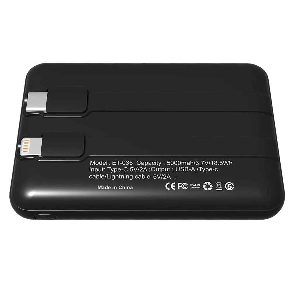 1. Модель оснащена выходом USB-A, а также встроенными кабелями Type-C / Lightning, что делает использование максимально удобным без необходимости носить дополнительные провода. Светодиодная подсветка логотипа синего цвета придаёт устройству современный, стильный внешний вид. Характеристики: Ёмкость: 5000 мАч Вход: Type-C 5V/2A Выход: USB-А, кабели Type-C / Lightning Подсветка логотипа