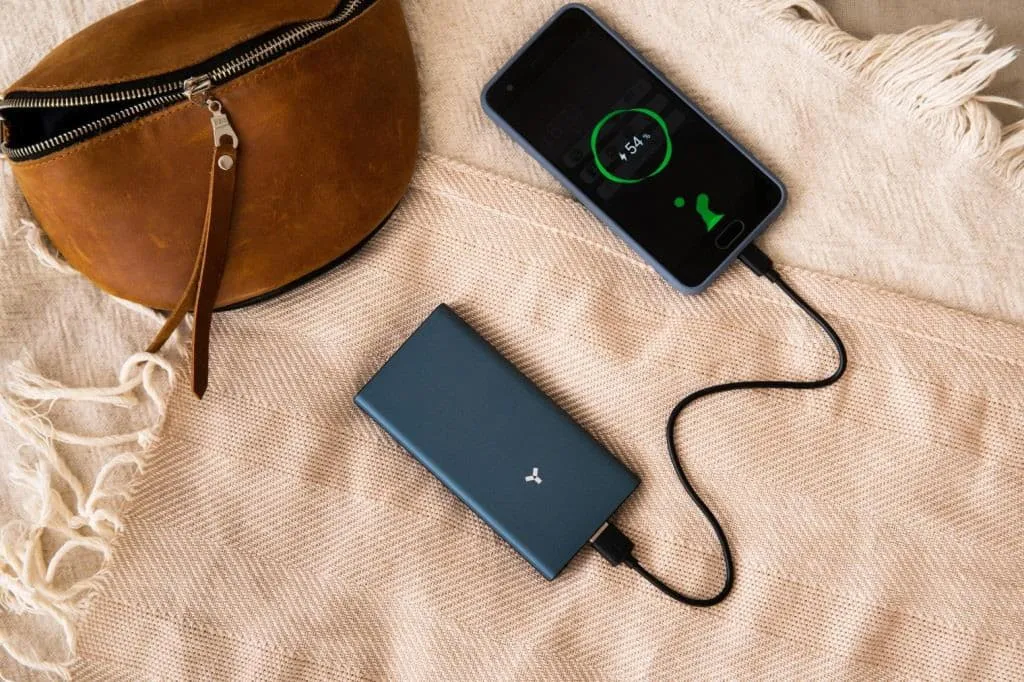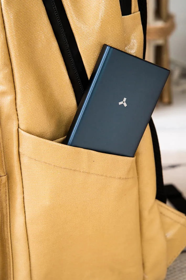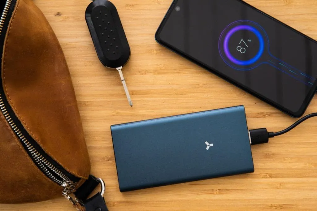 Несмотря на алюминиевый корпус толщина пауэрбанка менее 1,5 см, а вес всего 215 граммов. Износоустойчивый материал насыщенного синего цвета приятен на ощупь и не склонен к механическим повреждениям.