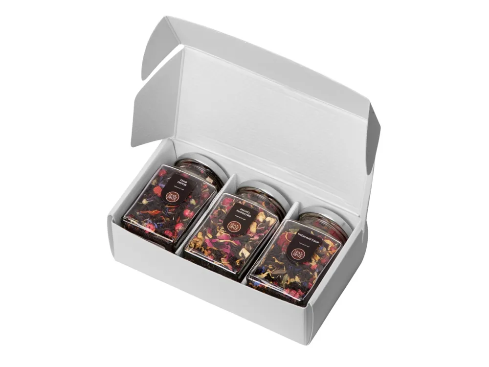 Набор подарочный «Bouquet» Для тех, кто хочет добавить в чаепитие новых красок, придумана серия «Bouquet». Каждый купаж чая в серии имеет разнообразные и неожиданные добавки фруктов, ягод или трав. Набор состоит из трёх видов чая: «Граф Орлов» - чёрный индийский чай с лепестками василька и ягодами красной смородины; «Моли Хуа» - китайский зелёный чай Тегуаньинь с бутонами жасмина; «Таёжный сбор» - чёрный индийский чай с лесными ягодами и мелиссой. - вес чая: 50, 65 и 40 гр.; - разнообразие вкусов и ощущений; - упаковка - стеклянная банка, надёжно сохраняющая все ароматы.