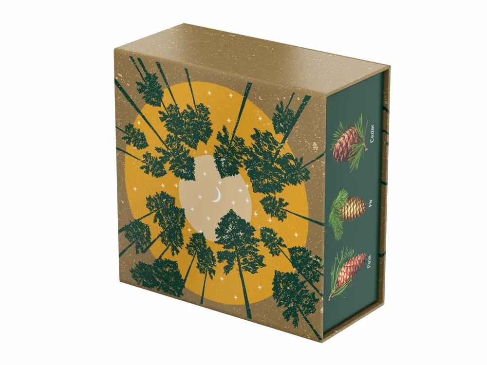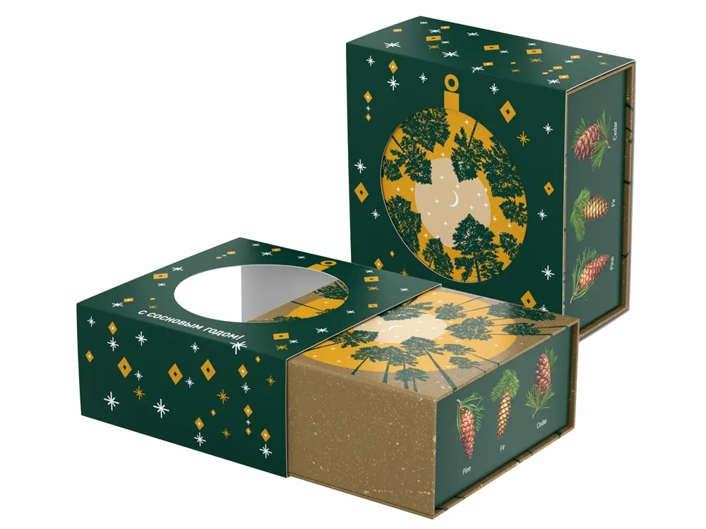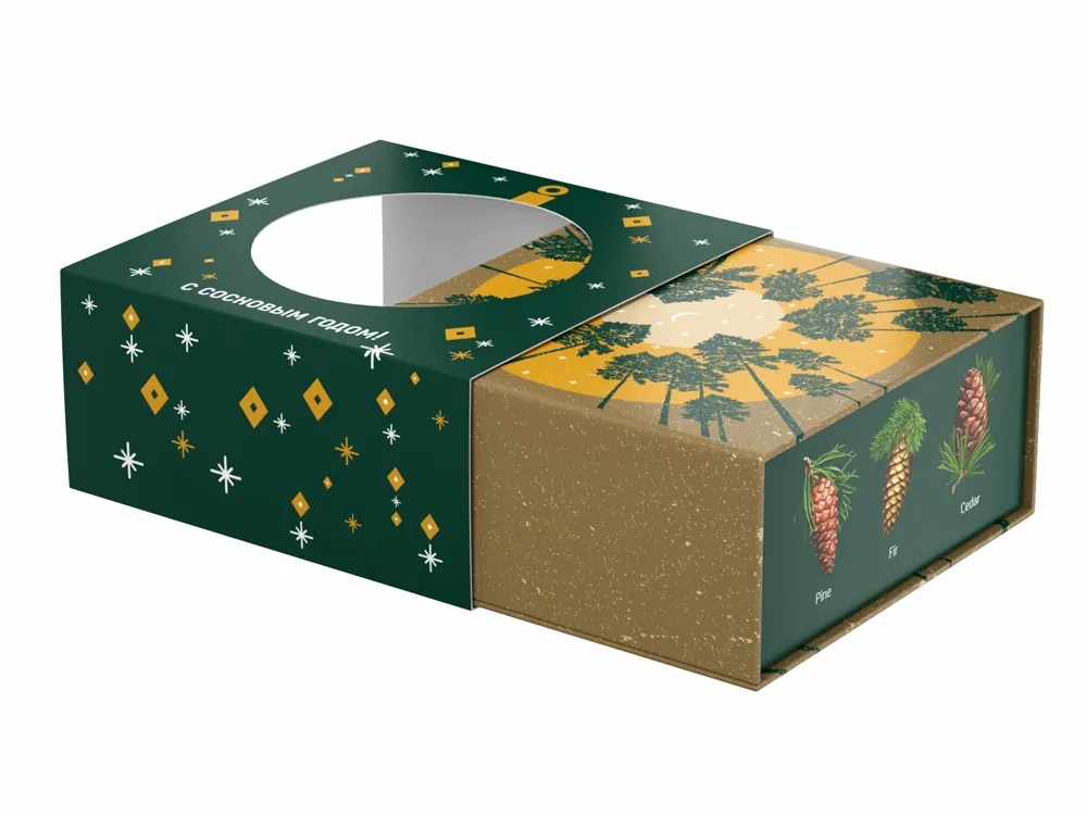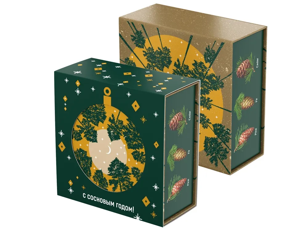 Аромат и вид хвои – символ Рождества и Нового года. «Хвойная» шкатулка «С сосновым годом!» оформлена праздничным паттерном и изображением шишек разных хвойных деревьев. На крышке шкатулки помещена иллюстрация, изображающая вид снизу вверх на звёздное небо и уходящие ввысь сосны. При надевании на шкатулку шубера (суперобложки) с круглым отверстием, на крышке шкатулки появляется вырубное изображение новогоднего шарика. Состав: Варенье из шишек (40г): шишки сосновые, сахар, вода. Чай с пихтой и ягодами можжевельника (50г): черный чай, хвоя пихты, ягоды можжевельника. Пастила с кедровыми орешками (50г): яблоко, яичный белок, кедровые орехи. Миндаль в шоколадной глазури (40г): шоколадная глазурь (сахар-песок, эквивалент какао-масла, эмульгаторы, антиокислитель (Е306), какао порошок эмульгатор (Е476), аромативатор «Ванилин», миндаль, сахарная пудра, масло какао, глазирователь.