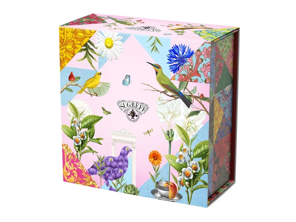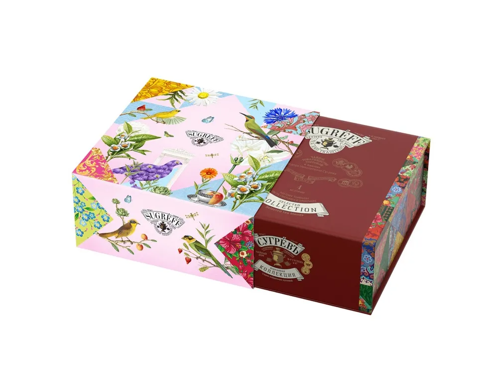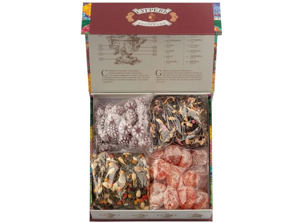 Купажи чая составлены так, чтобы сочетать вкус и аромат отборных сортов китайского и индийского чай с красотой разноцветных лепестков мальвы, лилии, жасмина и акации. В набор также входят монпансье со вкусом чёрной смородины и цукаты из кумквата. Внутри шкатулки находится мини-открытка, которую покупатель может подписать. Состав: Купаж 1: тегуаньинь, цветы акации, цвет жасмина, ароматизатор. Купаж 2: чай чёрный индийский, цветы лиии, мальва, ароматизатор. Кумкват: кумкват, сахар, Е220. Карамель со вкусом "Черная смородина" : патока, вода, регуляторы кислотности (лимонная кислота, молочная кислота), ароматизаторы, идентичные натуральным, краситель: кармин, сахар.