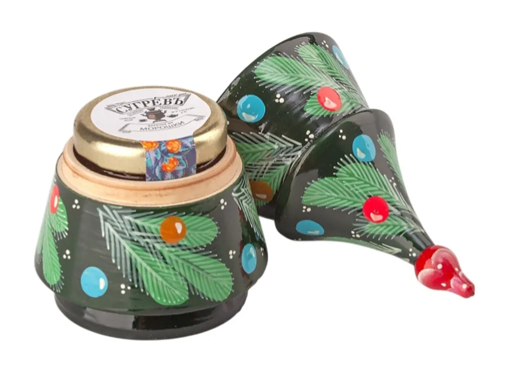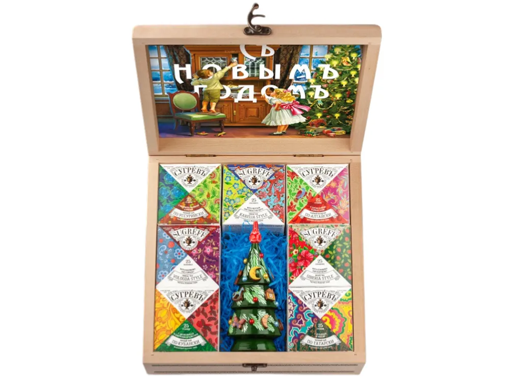 Подарочный набор из семи эксклюзивных купажей листового чая, характерных для разных регионов России и елки ручной работы с натуральным вареньем, в сувенирной шкатулке из массива берёзы. В набор входит: - По-алтайски: иван-чай, чай зелёный, имбирь, ромашка, сагаан-дали, цветки гомфрены, красная смородина, вишня. - По-кубански: чай чёрный байховый, лепестки календулы, ягоды облепихи, имбирь, цветки апельсинового дерева, шелковица. - По-уссурийски: чай чёрный байховый, ягоды можжевельника, мята, рябина черноплодная, клюква. - По-сибирски: чай чёрный байховый, шиповник, цветок пиона, мята, брусника, кусочки малины. - По-вологодски: гибискус, яблоко, ромашка, мята, малина, календула. - По-карельски: чай зелёный, незабудка, вереск, рябина черноплодная, черника, брусника, мята. - По-московски: чай чёрный байховый, кусочки яблока, кусочки лесной груши, ягоды вишни, шиповник, кусочки малины. - Варенье из морошки: ягода морошки, сахар
